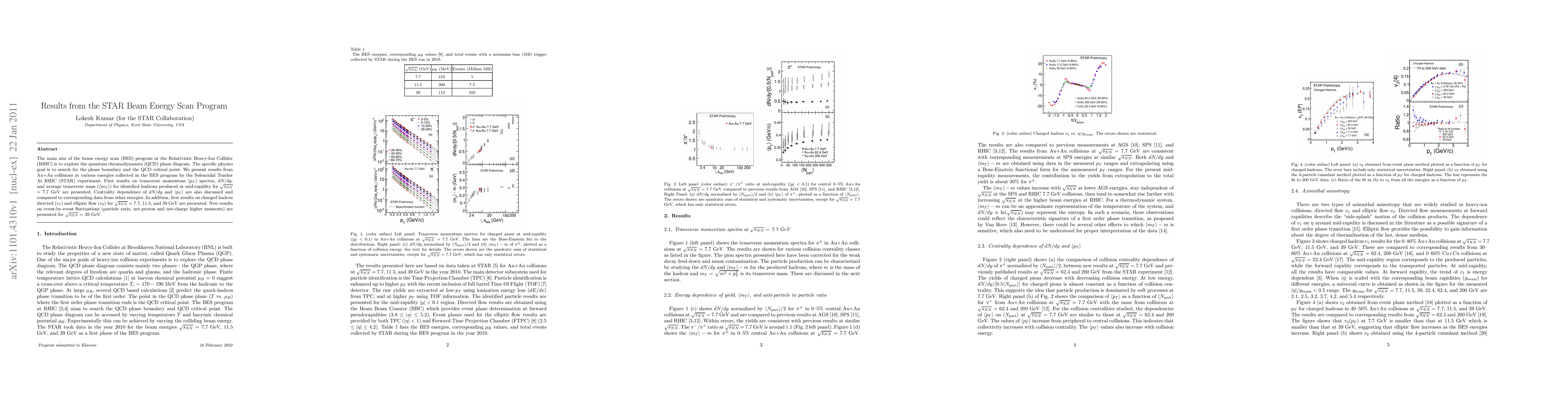 The main aim of the beam energy scan (BES) program at the Relativistic Heavy-Ion Collider (RHIC) is to explore the quantum chromodynamics (QCD) phase diagram. The specific physics goal is to search for the phase boundary and the QCD critical point. We present results from Au+Au collisions at various energies collected in the BES program by the Solenoidal Tracker At RHIC (STAR) experiment. First results on transverse momentum ($p_{T}$) spectra, $dN/dy$, and average transverse mass ($< m_{T} >$) for identified hadrons produced at mid-rapidity for $\sqrt{s_{NN}}$ = 7.7 GeV are presented. Centrality dependence of $dN/dy$ and $< p_{T} >$ are also discussed and compared to corresponding data from other energies. In addition, first results on charged hadron directed ($v_{1}$) and elliptic flow ($v_{2}$) for $\sqrt{s_{NN}}=$ 7.7, 11.5, and 39 GeV are presented. New results on event-by-event fluctuations (particle ratio, net-proton and net-charge higher moments) are presented for $\sqrt{s_{NN}}=$ 39 GeV.