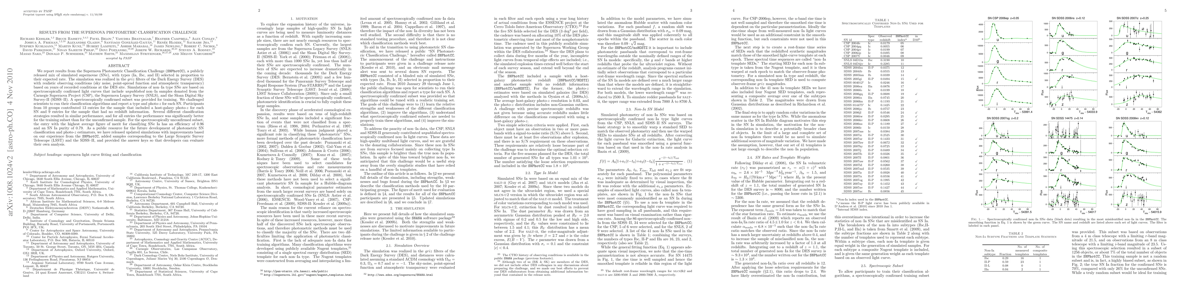 The Supernova Photometric Classification Challenge (SNPCC) tested various classification algorithms on a simulated dataset of supernovae, showing better performance on a training subset. The challenge released updated simulations and answer keys to aid future development in photometric classification and photo-z estimation.