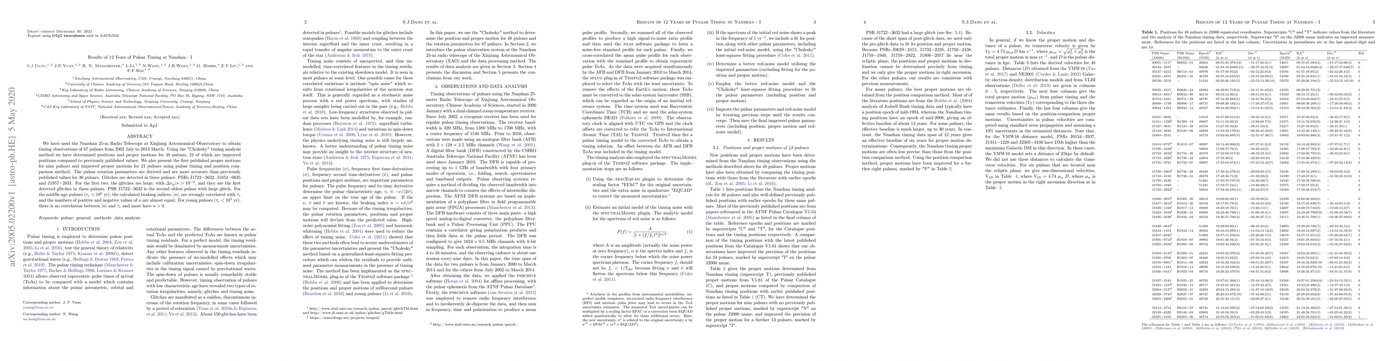 This study reports 12 years of pulsar timing observations, yielding improved positions, proper motions, and rotation parameters for 48 pulsars, as well as the detection of glitches in three pulsars.