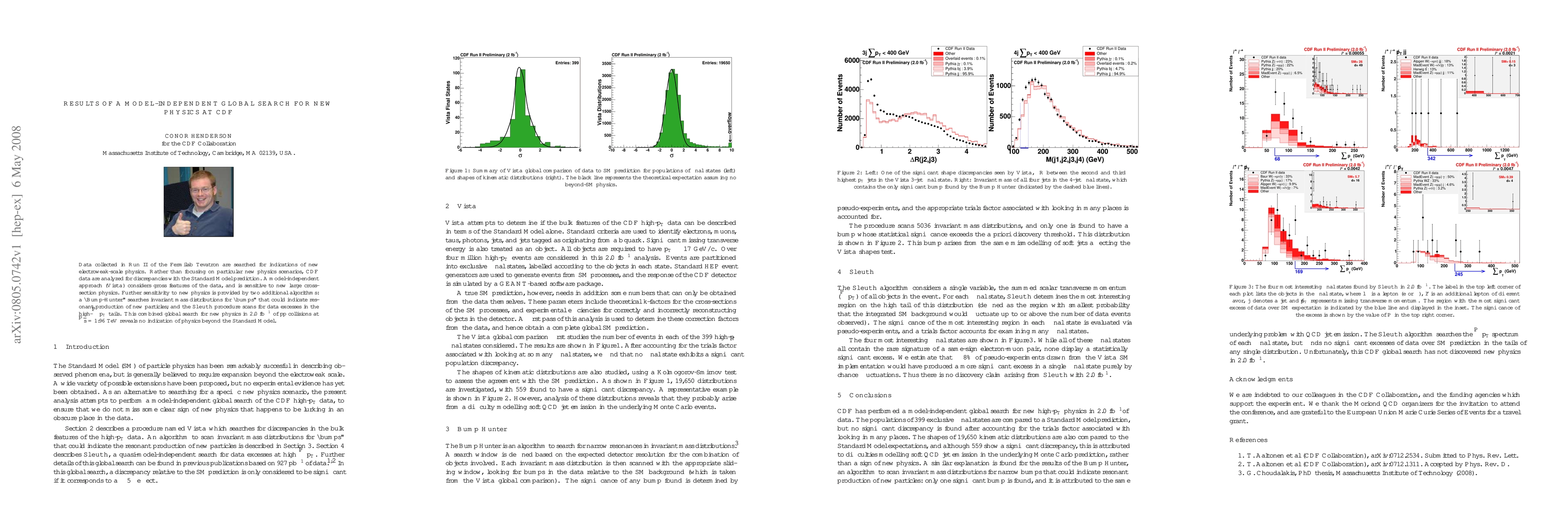 Data collected in Run II of the Fermilab Tevatron are searched for indications of new electroweak-scale physics. Rather than focusing on particular new physics scenarios, CDF data are analyzed for discrepancies with the Standard Model prediction. A model-independent approach (Vista) considers gross features of the data, and is sensitive to new large cross-section physics. Further sensitivity to new physics is provided by two additional algorithms: a ``Bump-Hunter'' searches invariant mass distributions for ``bumps'' that could indicate resonant production of new particles; and the Sleuth procedure scans for data excesses in the high-pT tails. This combined global search for new physics in 2.0/fb of p-pbar collisions at sqrt(s)=1.96 TeV reveals no indication of physics beyond the Standard Model.