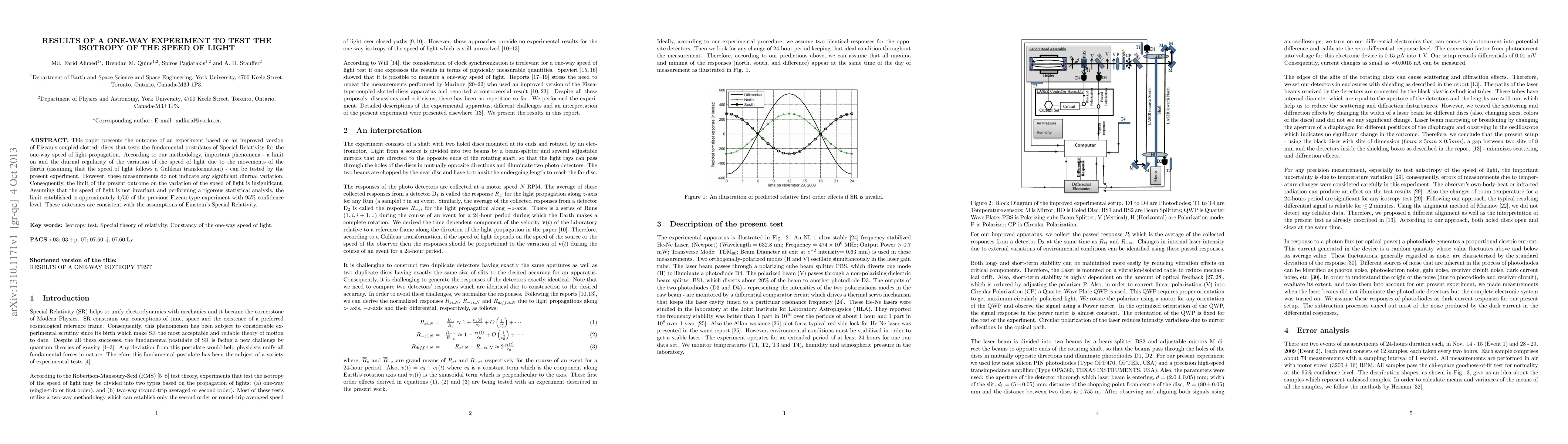 This experiment, based on an improved Fizeau apparatus, tests the isotropy of the speed of light and finds no significant diurnal variation, supporting Einstein's Special Relativity and establishing a limit on the speed of light variation at approximately 1/50 of previous Fizeau-type experiments.