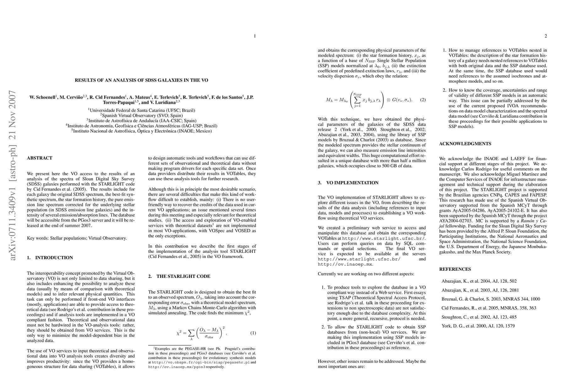 We present here the VO access to the results of an analysis of the spectra of Sloan Digital Sky Survey (SDSS) galaxies performed with the STARLIGHT code by Cid Fernandes et al. (2005). The results include for each galaxy the original SDSS spectrum, the best-fit synthetic spectrum, the star formation history, the pure emission line spectrum corrected from underlying stellar population (in SDSS emission line galaxies) and the intensity of several emission/absorption lines. The database will be accessible from the PGos3 at the end of summer 2007.