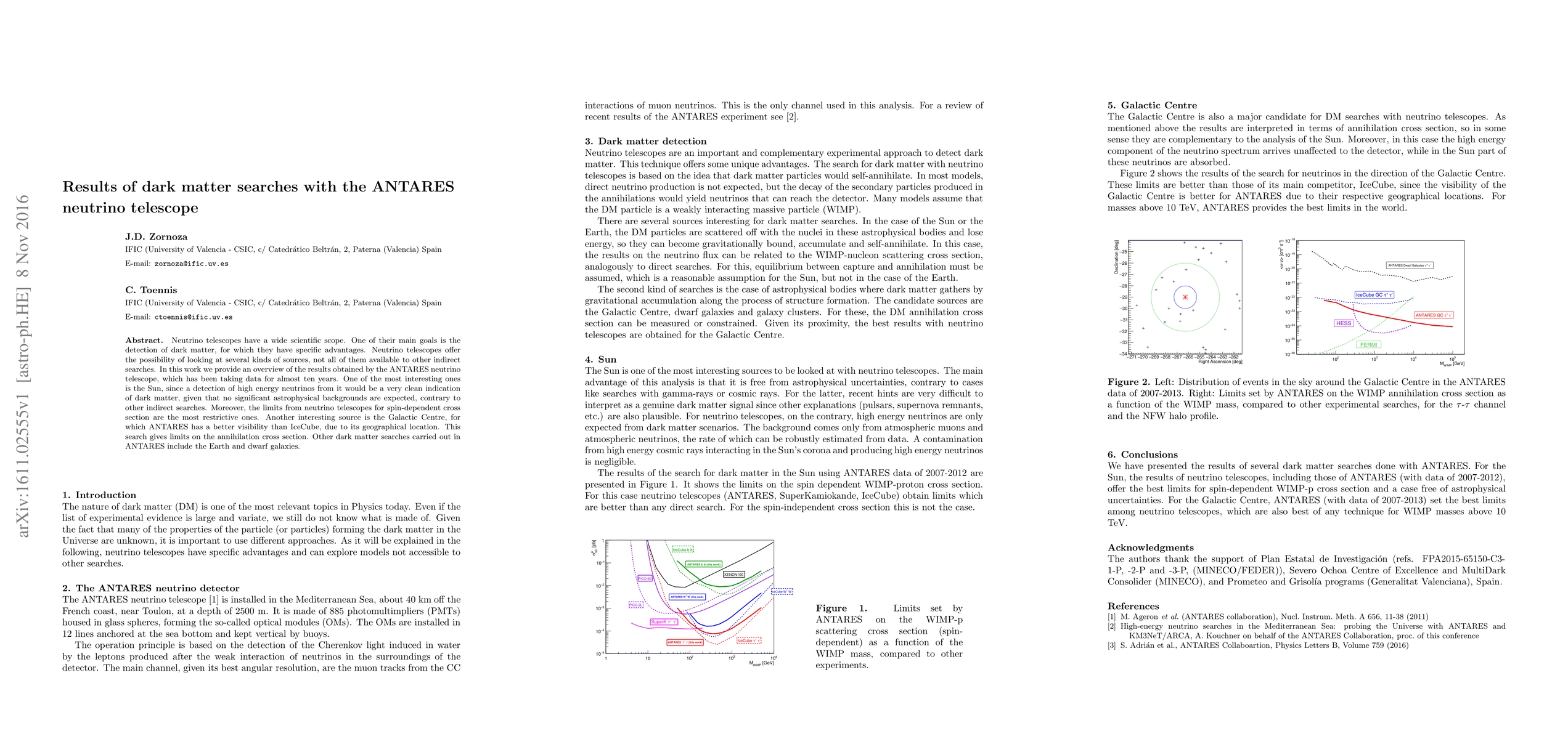 The ANTARES neutrino telescope has provided significant results in dark matter searches, notably setting restrictive limits on the spin-dependent cross section. The telescope's unique vantage point also enhances its visibility for the Galactic Centre, offering limits on the annihilation cross section, while searches in the Sun, Earth, and dwarf galaxies further contribute to the understanding of dark matter.