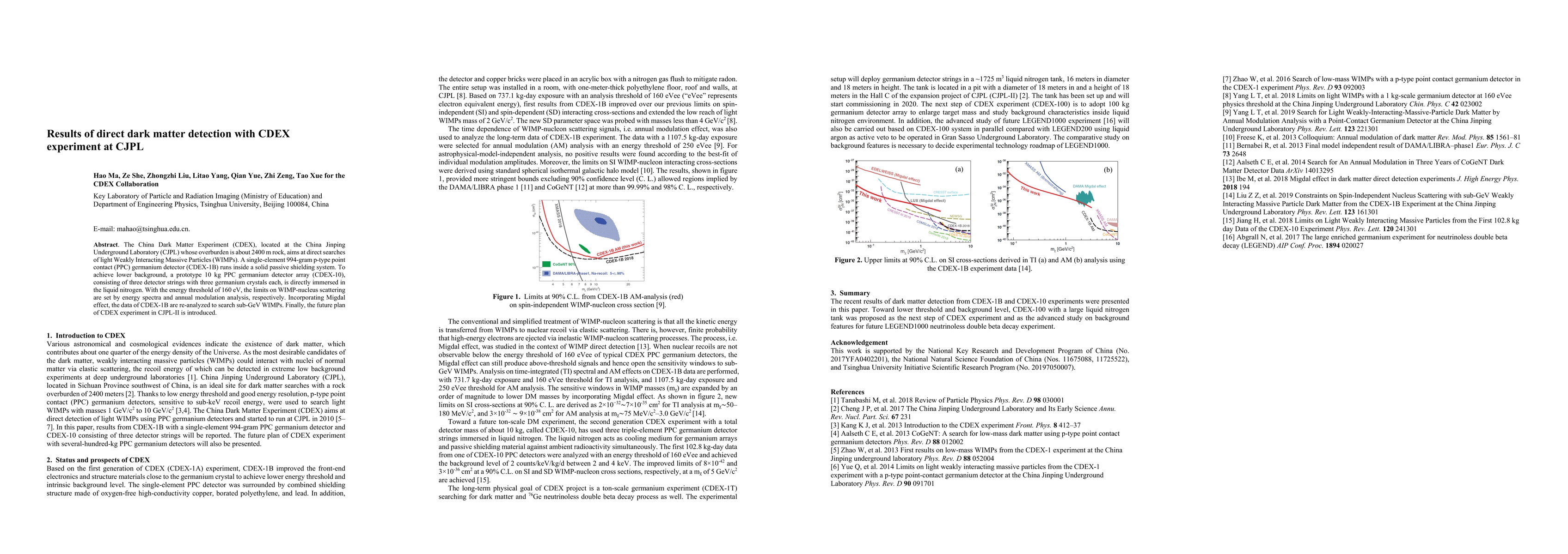 The CDEX experiment at CJPL uses germanium detectors to search for light WIMPs, setting limits on WIMP-nucleus scattering through energy spectra and annual modulation analysis. Future plans include expanding to a 10kg detector array for enhanced sensitivity.