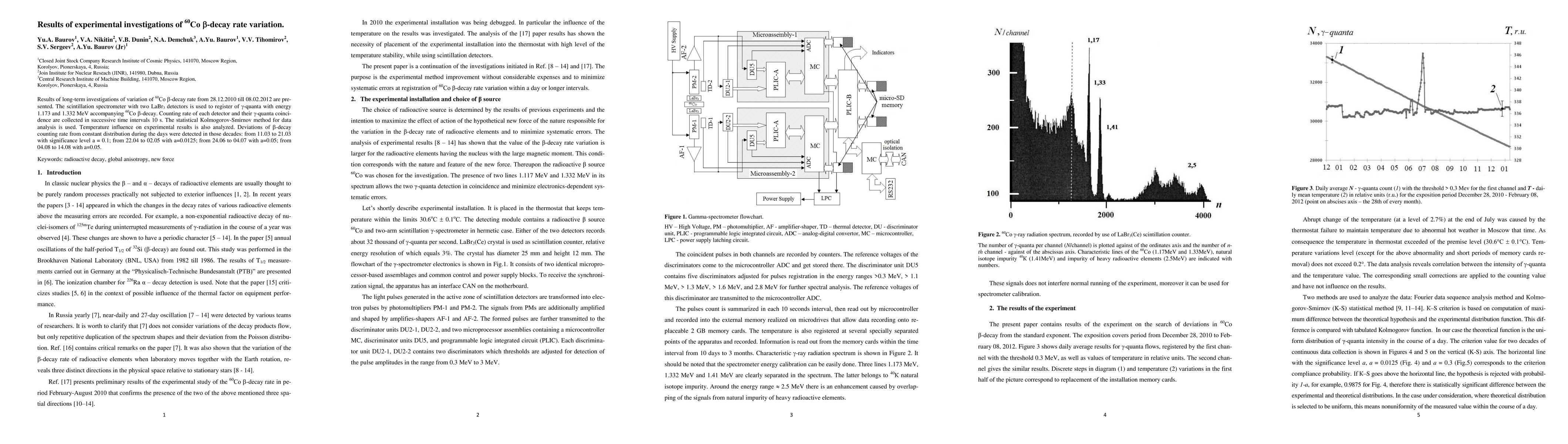 Results of long-term investigations of variation of cobalt beta decay rate from 28.12.2010 till 08.02.2012 are presented. The scintillation spectrometer with two LaBr3 detectors is used to register of gamma-quanta with energy 1.173 and 1.332 MeV accompanying cobalt beta decay. Counting rate of each detector and their gamma-quanta coincidence are collected in successive time intervals 10 s. The statistical Kolmogorov-Smirnov method for data analysis is used. Temperature influence on experimental results is also analyzed. Deviations of beta decay counting rate from constant distribution during the days were detected in those decades: from 11.03 to 21.03 with significance level a = 0.1; from 22.04 to 02.05 with a=0.0125; from 24.06 to 04.07 with a=0.05; from 04.08 to 14.08 with a=0.05.
