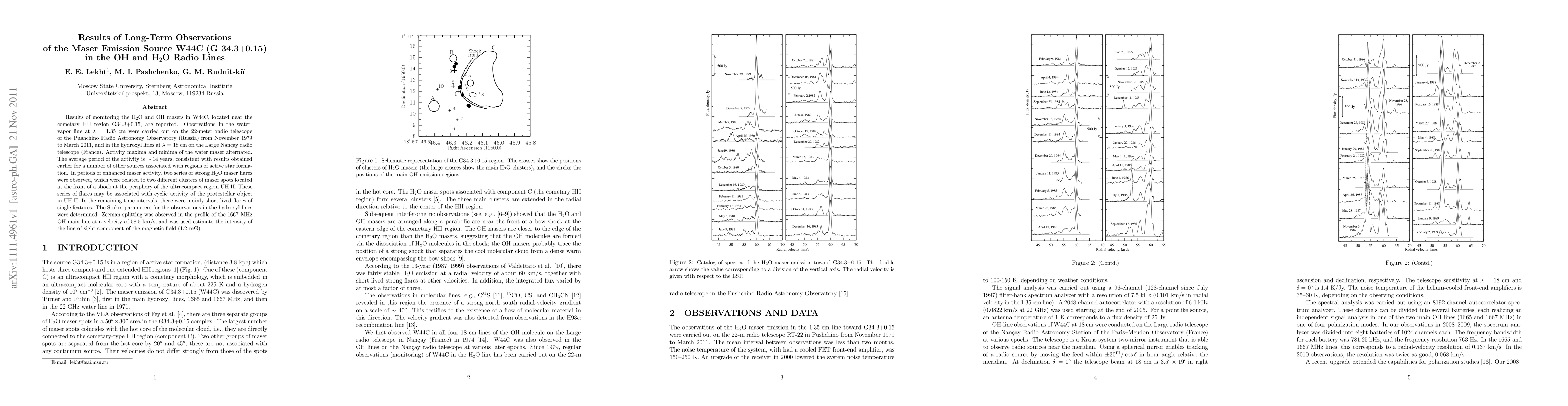 Results of monitoring the H$_2$O and OH masers in W44C, located near the cometary HII region G34.3+0.15, are reported. Observations in the water-vapor line at $\lambda = 1.35$ cm were carried out on the 22-meter radio telescope of the Pushchino Radio Astronomy Observatory (Russia) from November 1979 to March 2011, and in the hydroxyl lines at $\lambda = 18$ cm on the Large Nan{\c{c}}ay radio telescope (France). Activity maxima and minima of the water maser alternated. The average period of the activity is $\sim 14$ years, consistent with results obtained earlier for a number of other sources associated with regions of active star formation. In periods of enhanced maser activity, two series of strong H$_2$O maser flares were observed, which were related to two different clusters of maser spots located at the front of a shock at the periphery of the ultracompact region UH II. These series of flares may be associated with cyclic activity of the protostellar object in UH II. In the remaining time intervals, there were mainly short-lived flares of single features. The Stokes parameters for the observations in the hydroxyl lines were determined. Zeeman splitting was observed in the profile of the 1667 MHz OH main line at a velocity of 58.5 km/s, and was used estimate the intensity of the line-of-sight component of the magnetic field (1.2 mG).