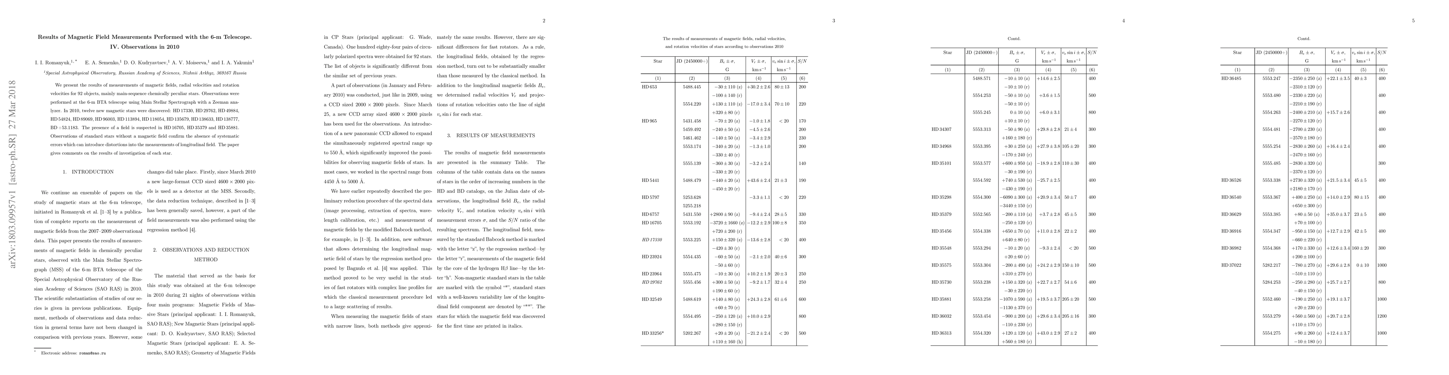 We present the results of measurements of magnetic fields, radial velocities and rotation velocities for 92 objects, mainly main-sequence chemically peculiar stars. Observations were performed at the 6-m BTA telescope using Main Stellar Spectrograph with a Zeeman analyzer. In 2010, twelve new magnetic stars were discovered: HD\,17330, HD\,29762, HD\,49884, HD\,54824, HD\,89069, HD\,96003, HD\,113894, HD\,118054, HD\,135679, HD\,138633, HD\,138777, BD\,+53.1183. The presence of a field is suspected in HD\,16705, HD\,35379 and HD\,35881. Observations of standard stars without a magnetic field confirm the absence of systematic errors which can introduce distortions into the measurements of longitudinal field. The paper gives comments on the results of investigation of each star.