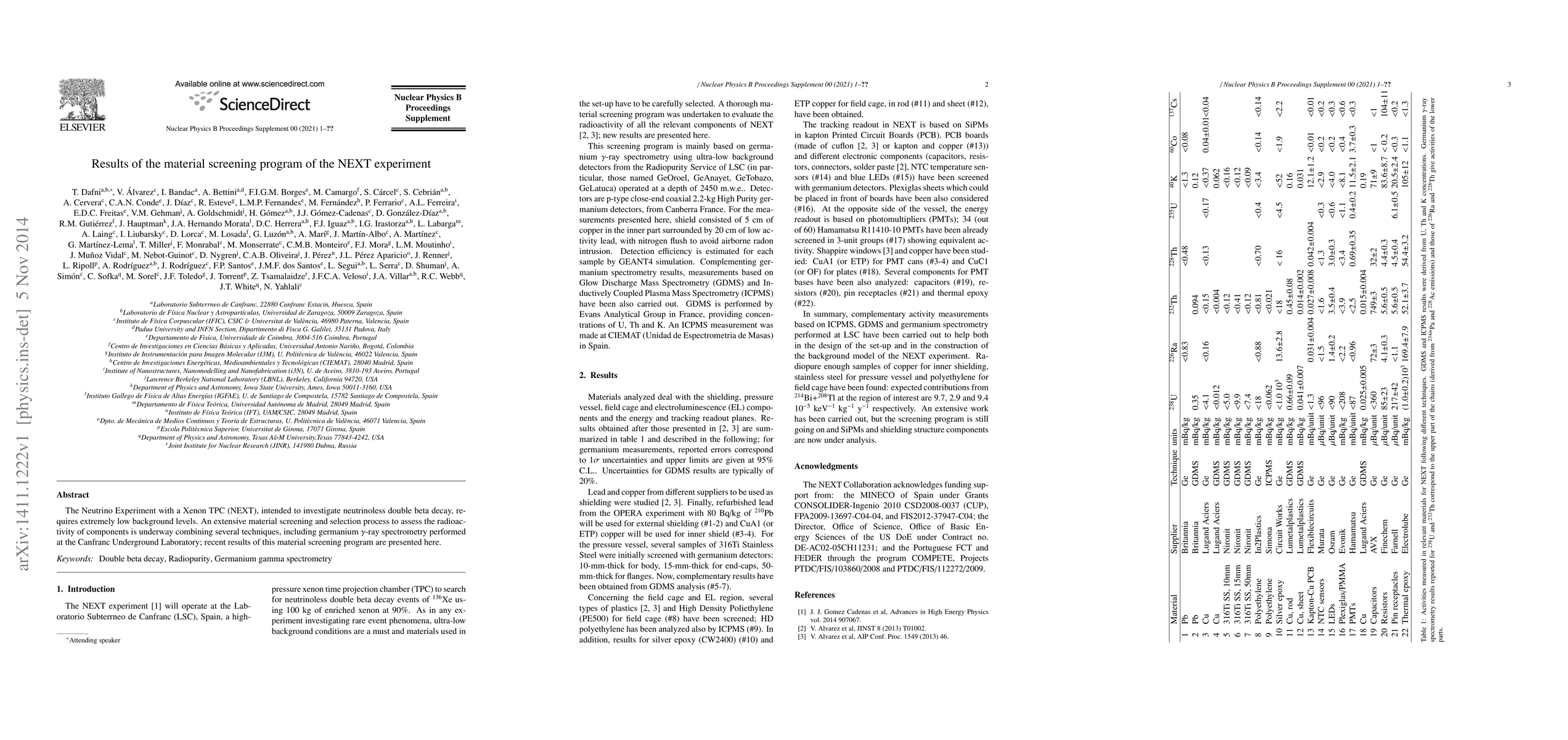 The NEXT experiment aims to detect neutrinoless double beta decay, necessitating stringent material screening for low background radioactivity. Recent results from the screening program, utilizing germanium gamma-ray spectrometry at the Canfranc Underground Laboratory, are reported.