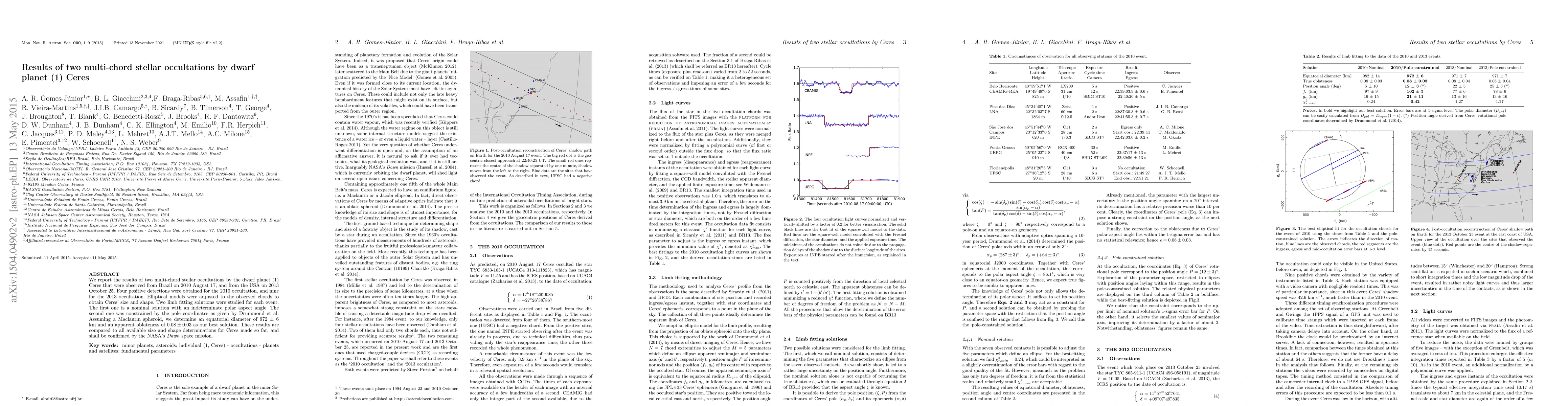 This study reports the results of two multi-chord stellar occultations by Ceres, determining its size and shape through elliptical models. The best solution estimates an equatorial diameter of 972 ± 6 km and an apparent oblateness of 0.08 ± 0.03.