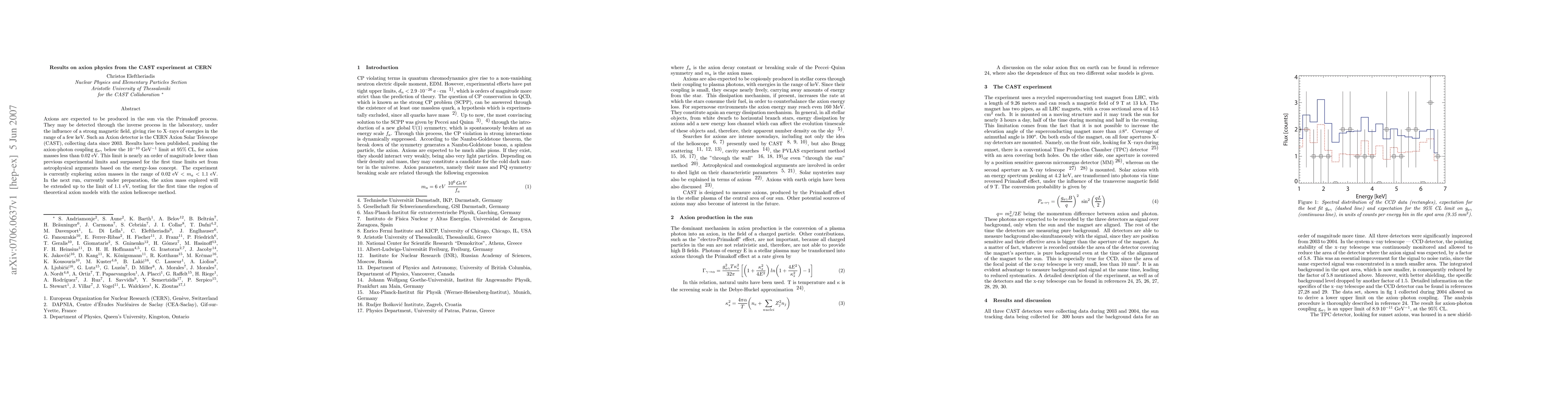 Axions are expected to be produced in the sun via the Primakoff process. They may be detected through the inverse process in the laboratory, under the influence of a strong magnetic field, giving rise to X-rays of energies in the range of a few keV. Such an Axion detector is the CERN Axion Solar Telescope (CAST), collecting data since 2003. Results have been published, pushing the axion-photon coupling g$_{a\gamma}$ below the 10$^{-10}$ GeV$^{-1}$ limit at 95% CL, for axion masses less than 0.02 eV. This limit is nearly an order of magnitude lower than previous experimental limits and surpassed for the first time limits set from astrophysical arguments based on the energy-loss concept. The experiment is currently exploring axion masses in the range of 0.02 eV $< m_a <$ 1.1 eV. In the next run, currently under preparation, the axion mass explored will be extended up to the limit of 1.1 eV, testing for the first time the region of theoretical axion models with the axion helioscope method.