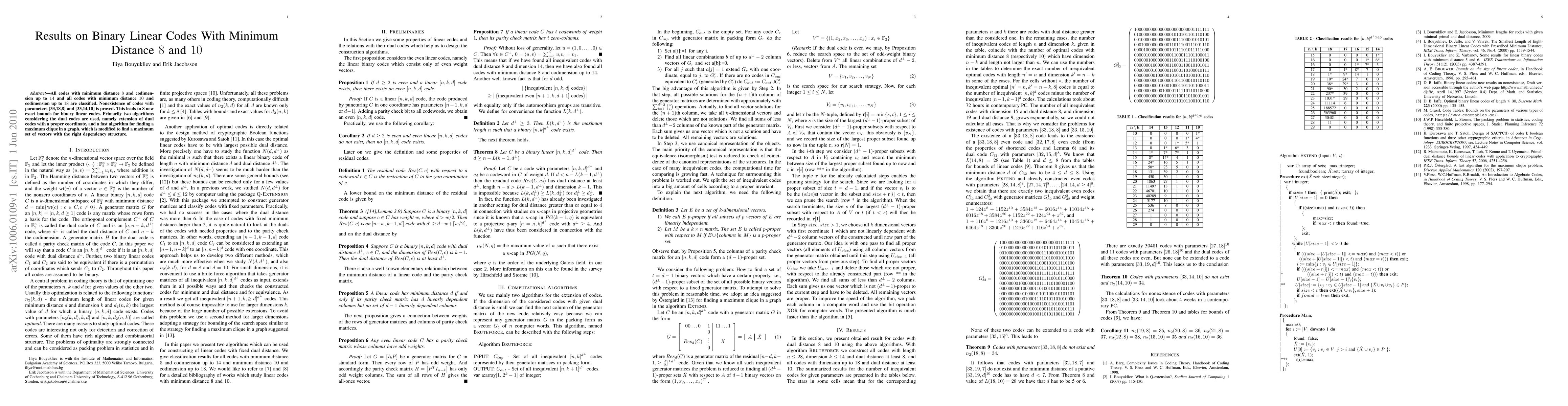 All codes with minimum distance 8 and codimension up to 14 and all codes with minimum distance 10 and codimension up to 18 are classified. Nonexistence of codes with parameters [33,18,8] and [33,14,10] is proved. This leads to 8 new exact bounds for binary linear codes. Primarily two algorithms considering the dual codes are used, namely extension of dual codes with a proper coordinate, and a fast algorithm for finding a maximum clique in a graph, which is modified to find a maximum set of vectors with the right dependency structure.
