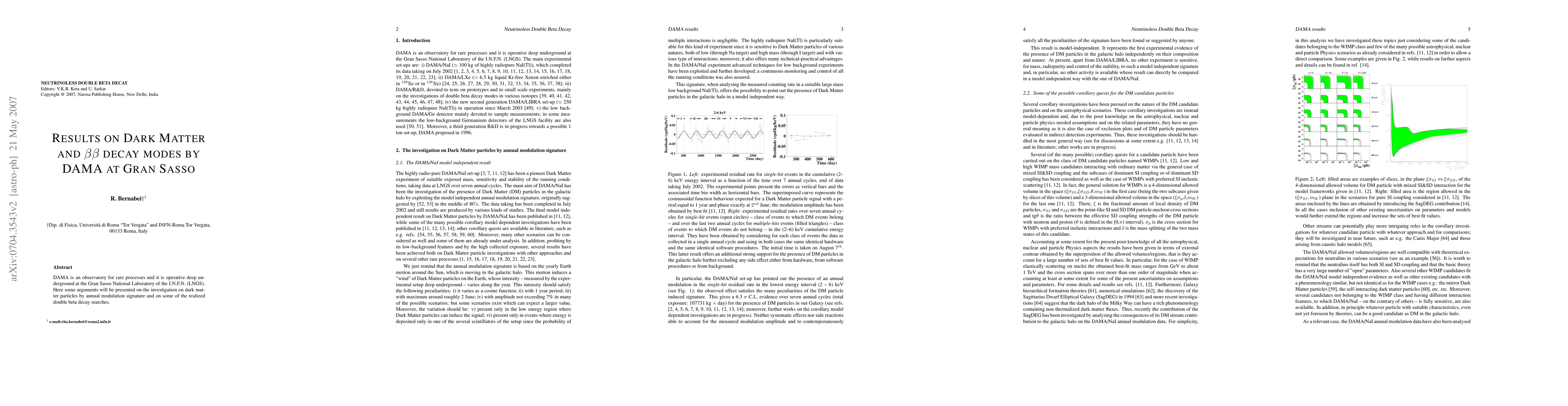 Summary: DAMA's research at Gran Sasso investigates dark matter via annual modulation and explores double beta decay modes, utilizing its deep underground observatory to detect rare processes.