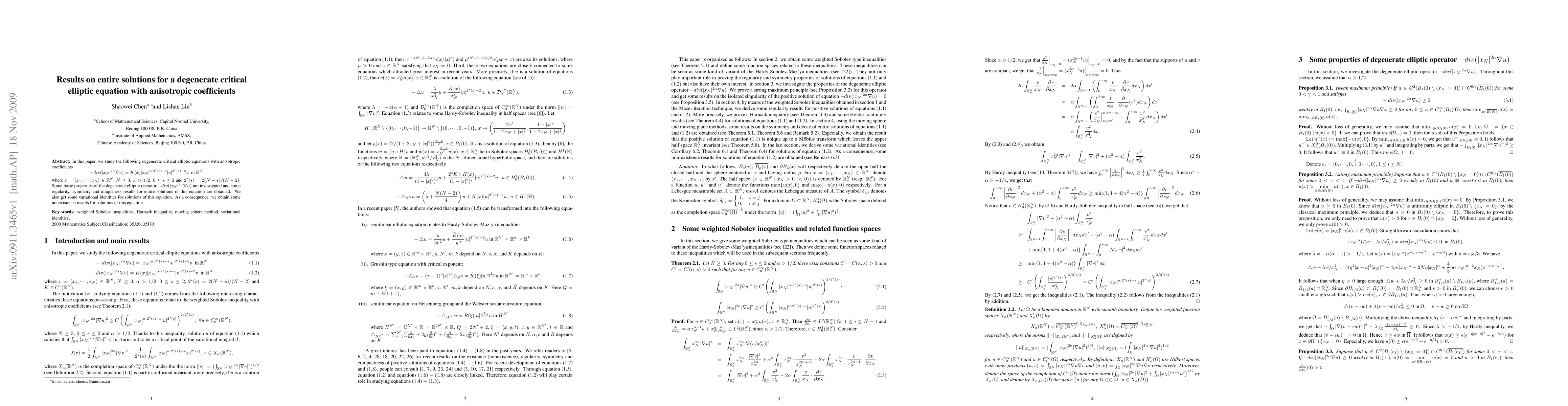 This paper investigates degenerate critical elliptic equations with anisotropic coefficients, deriving regularity, symmetry, and uniqueness results for entire solutions. It also establishes variational identities and provides nonexistence results for certain solutions.