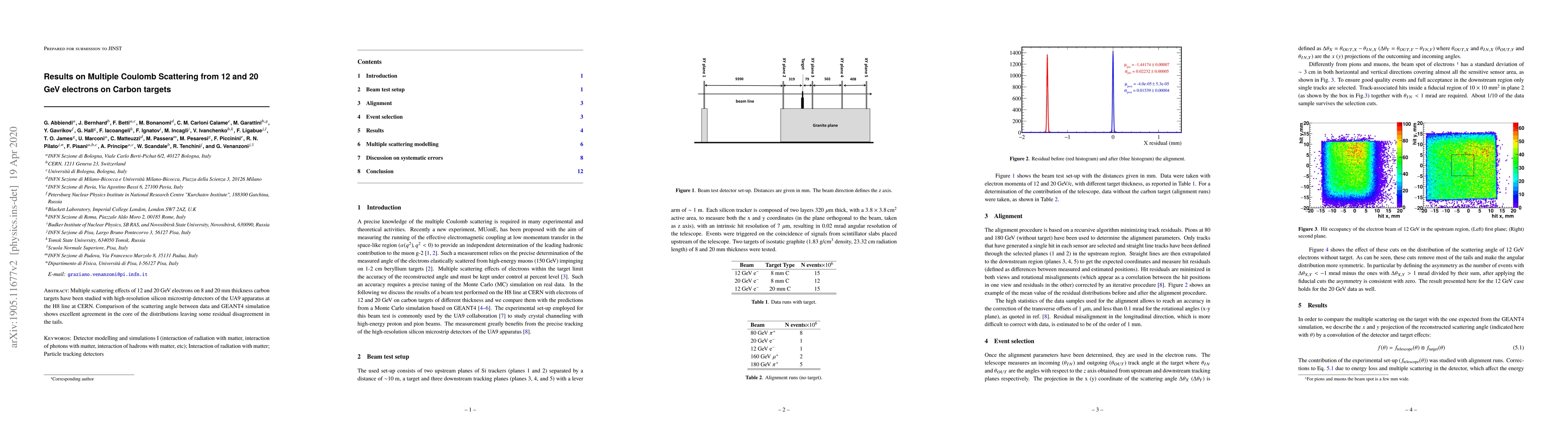 Summary: This study investigates multiple scattering of 12 and 20 GeV electrons on carbon targets using high-resolution silicon microstrip detectors, showing excellent agreement between data and GEANT4 simulations in scattering angles, with minor discrepancies in the tails.