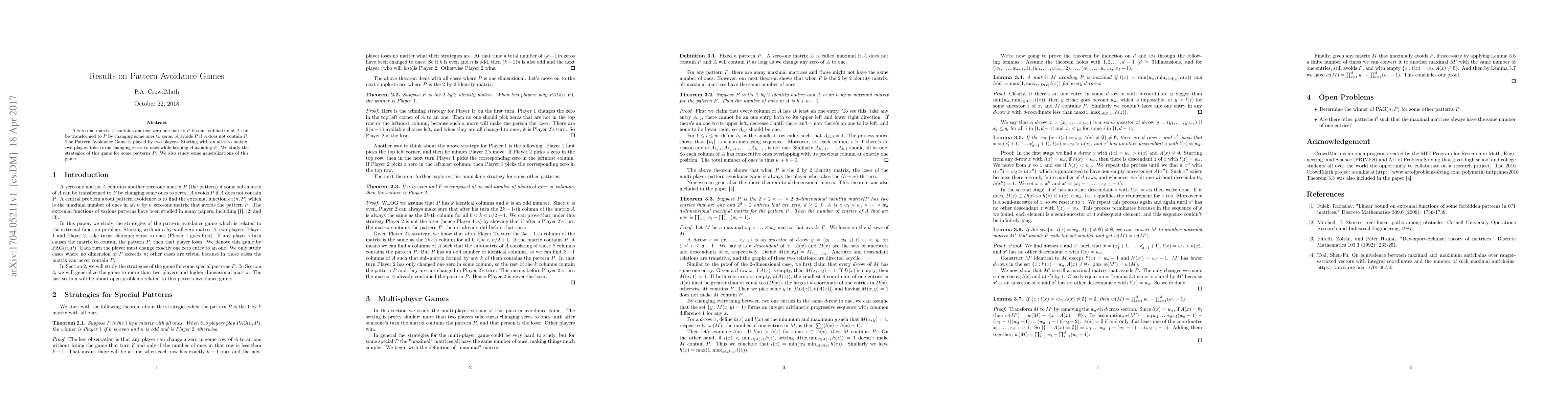 A zero-one matrix $A$ contains another zero-one matrix $P$ if some submatrix of $A$ can be transformed to $P$ by changing some ones to zeros. $A$ avoids $P$ if $A$ does not contain $P$. The Pattern Avoidance Game is played by two players. Starting with an all-zero matrix, two players take turns changing zeros to ones while keeping $A$ avoiding $P$. We study the strategies of this game for some patterns $P$. We also study some generalizations of this game.