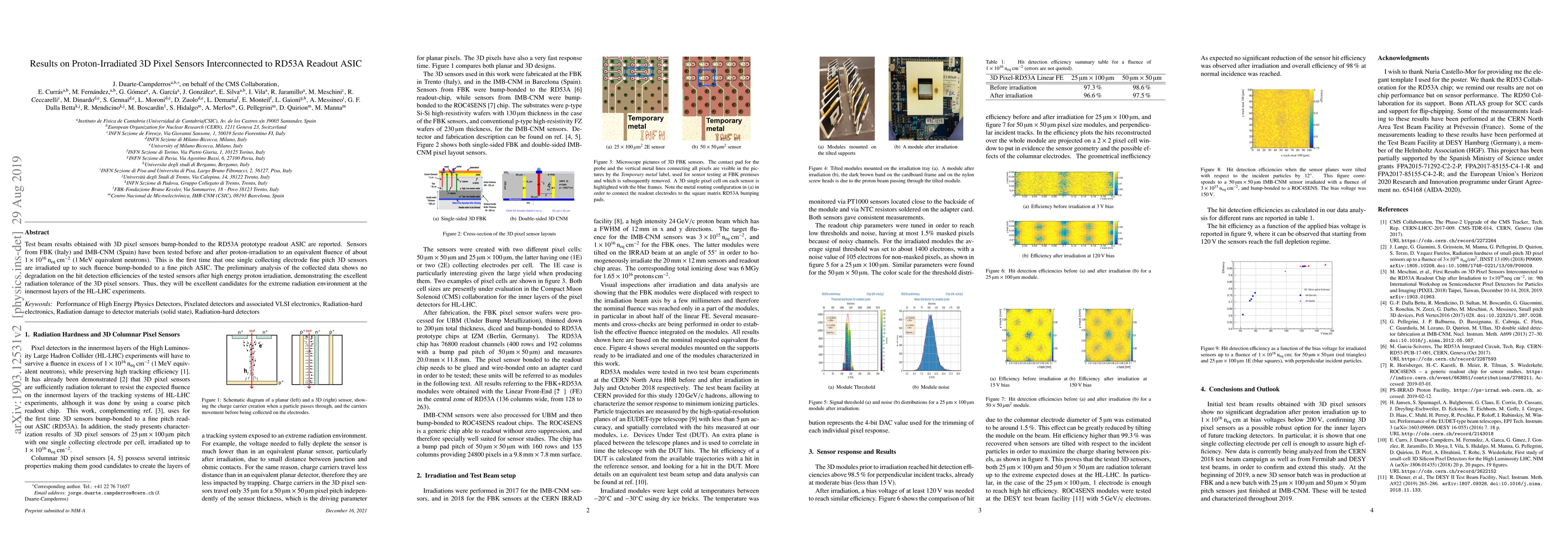 This study reports test beam results of 3D pixel sensors from FBK and IMB-CNM, interconnected to the RD53A readout ASIC, before and after proton irradiation. The sensors show no degradation in hit detection efficiency post-irradiation, indicating excellent radiation tolerance suitable for the HL-LHC experiments.