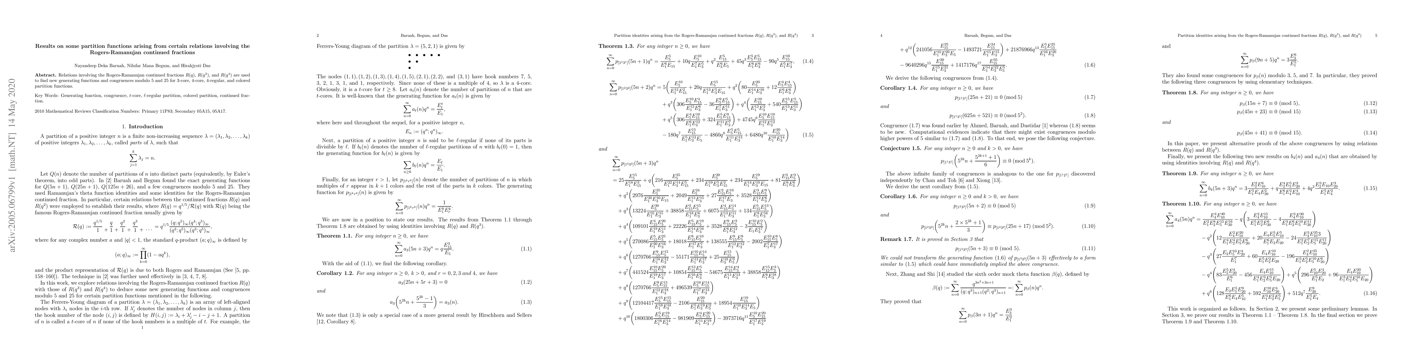 This research establishes new generating functions and congruences for various partition functions, utilizing relations from Rogers-Ramanujan continued fractions and focusing on partitions with specific core properties, with results modulo 5 and 25.