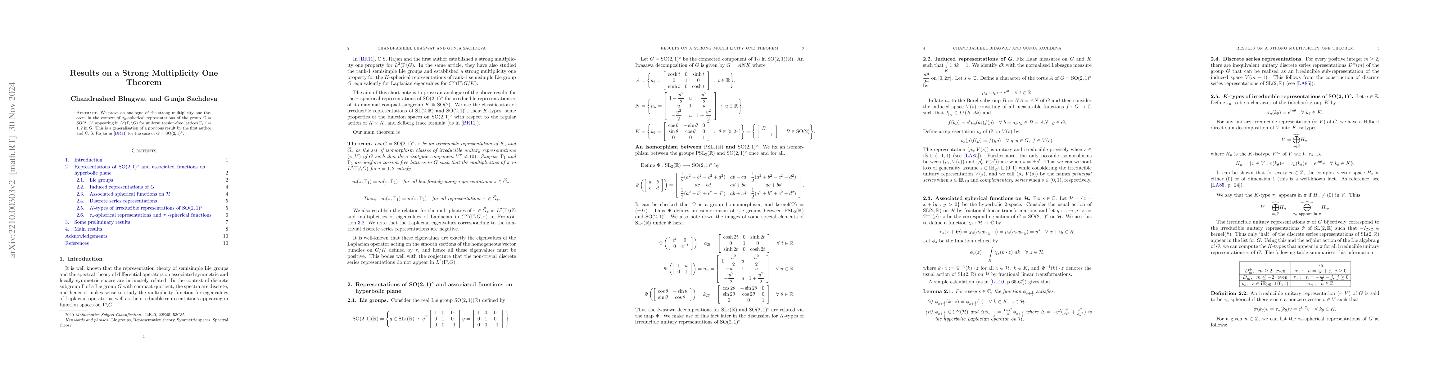 We prove an analogue of the strong multiplicity one theorem in the context of $\tau_n$-spherical representations of the group $G = SO(2,1)^\circ$ appearing in $L^2(\Gamma_i \backslash G)$ for uniform torsion-free lattices $\Gamma_i, i = 1, 2$ in $G$. This is a generalisation of a previous result by the first author and C. S. Rajan for the case of $G = SO(2,1)^\circ$.