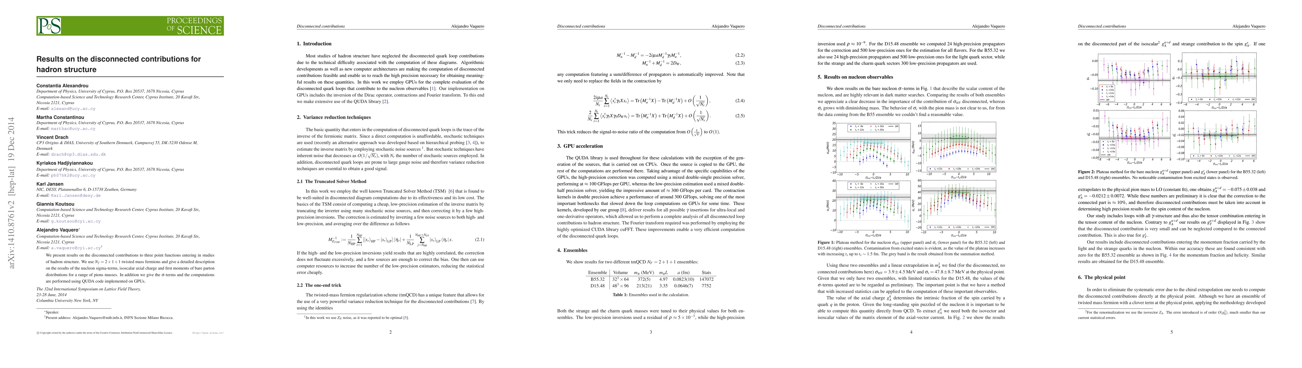 This study examines disconnected contributions to hadron structure using N_F = 2+1+1 twisted mass fermions. It provides detailed results for nucleon sigma-terms, isoscalar axial charge, and bare parton distribution moments across various pion masses. The computations, employing QUDA code on GPUs, also offer sigma-terms calculations.