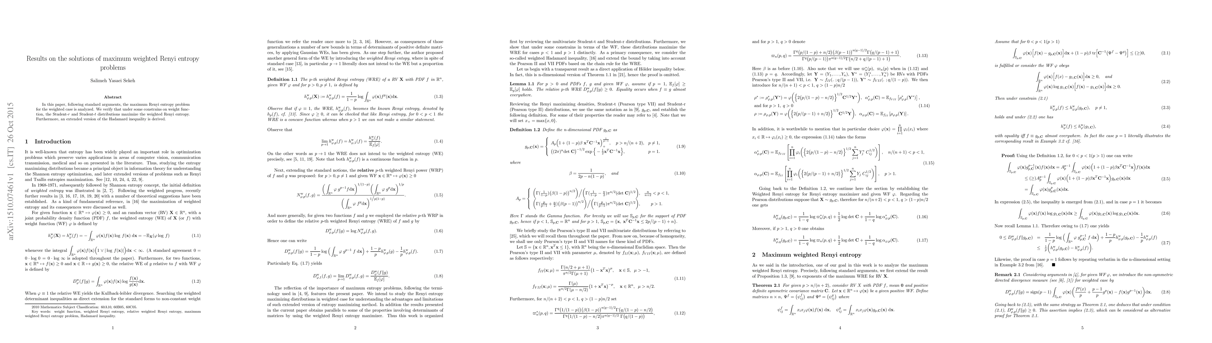 This paper analyzes the maximum weighted Renyi entropy problem, demonstrating that under certain constraints on the weight function, Student-r and Student-t distributions maximize it. An extended version of the Hadamard inequality is also derived.