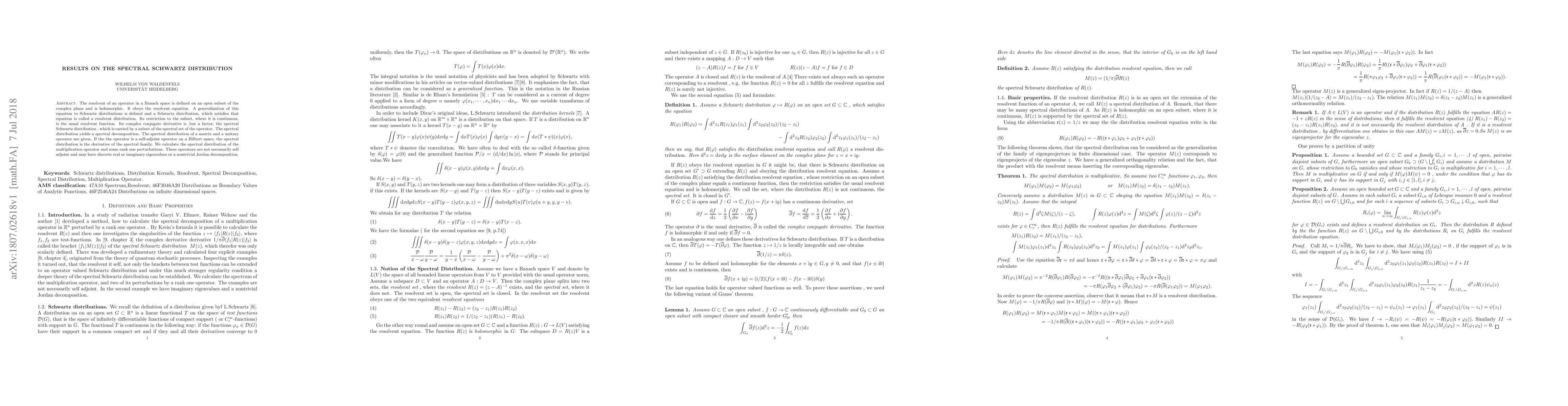 The resolvent of an operator in a Banach space is defined on an open subset of the complex plane and is holomorphic. It obeys the resolvent equation. A generalization of this equation to Schwartz distributions is defined and a Schwartz distribution, which satisfies that equation is called a resolvent distribution. Its restriction to the subset, where it is continuous, is the usual resolvent function. Its complex conjugate derivative is,but a factor, the spectral Schwartz distribution, which is carried by a subset of the spectral set of the operator. The spectral distribution yields a spectral decomposition. The spectral distribution of a matrix and a unitary operator are given. If the the operator is a self-adjoint operator on a Hilbert space, the spectral distribution is the derivative of the spectral family. We calculate the spectral distribution of the multiplication operator and some rank one perturbations. These operators are not necessarily self adjoint and may have discrete real or imaginary eigenvalues or a nontrivial Jordan decomposition.
