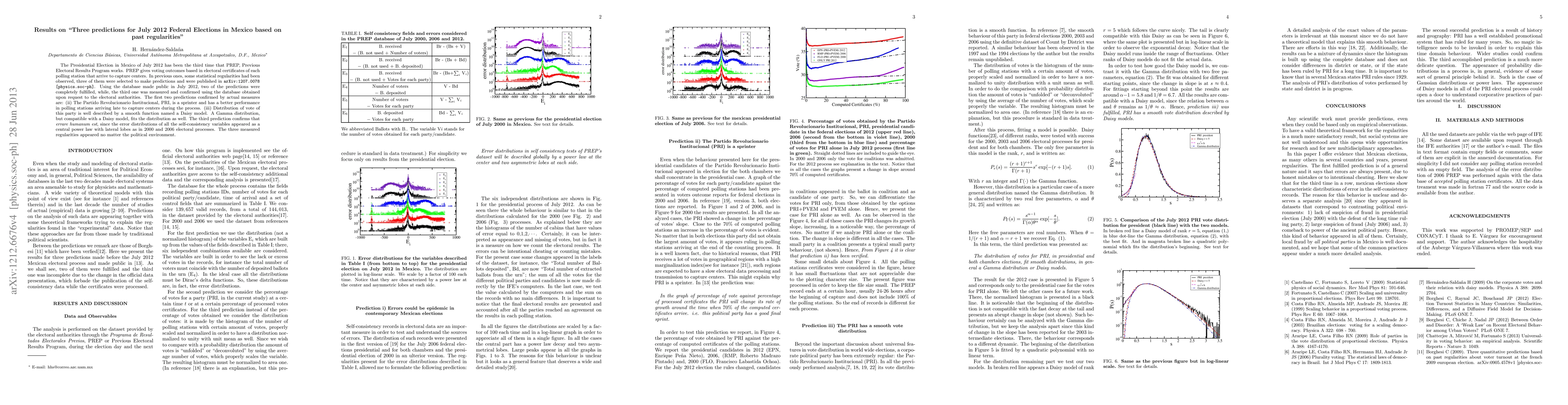 The Presidential Election in Mexico of July 2012 has been the third time that PREP, Previous Electoral Results Program works. PREP gives voting outcomes based in electoral certificates of each polling station that arrive to capture centers. In previous ones, some statistical regularities had been observed, three of them were selected to make predictions and were published in \texttt{arXiv:1207.0078 [physics.soc-ph]}. Using the database made public in July 2012, two of the predictions were completely fulfilled, while, the third one was measured and confirmed using the database obtained upon request to the electoral authorities. The first two predictions confirmed by actual measures are: (ii) The Partido Revolucionario Institucional, PRI, is a sprinter and has a better performance in polling stations arriving late to capture centers during the process. (iii) Distribution of vote of this party is well described by a smooth function named a Daisy model. A Gamma distribution, but compatible with a Daisy model, fits the distribution as well. The third prediction confirms that {\it errare humanum est}, since the error distributions of all the self-consistency variables appeared as a central power law with lateral lobes as in 2000 and 2006 electoral processes. The three measured regularities appeared no matter the political environment.