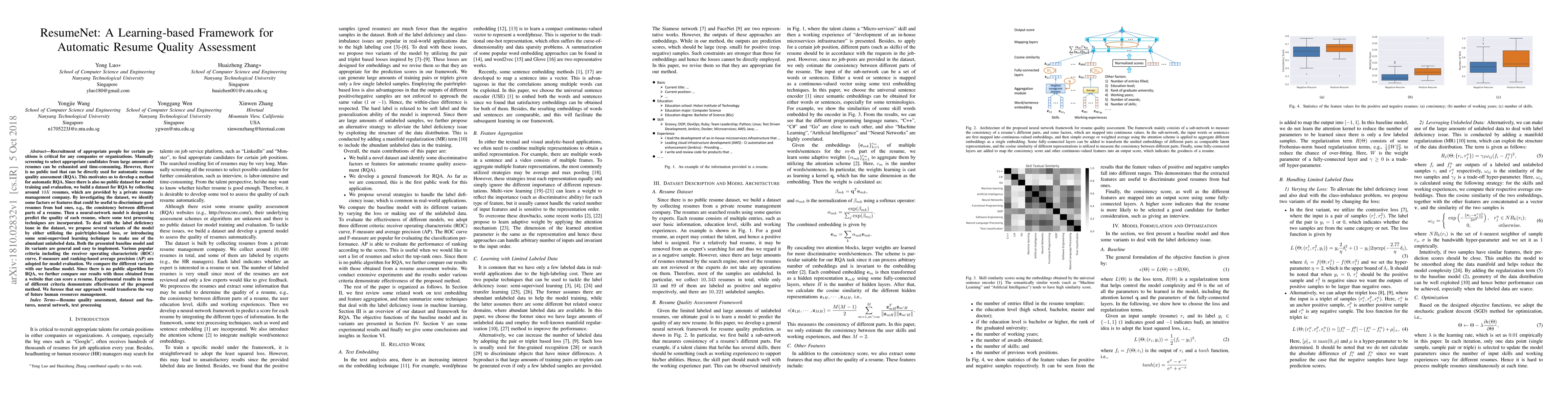 ResumeNet introduces a learning-based framework for automatic resume quality assessment, addressing the lack of public tools and datasets for this purpose. The authors build a dataset of 10K resumes and propose a neural-network model incorporating text processing techniques to predict resume quality, comparing various model variants to improve performance.