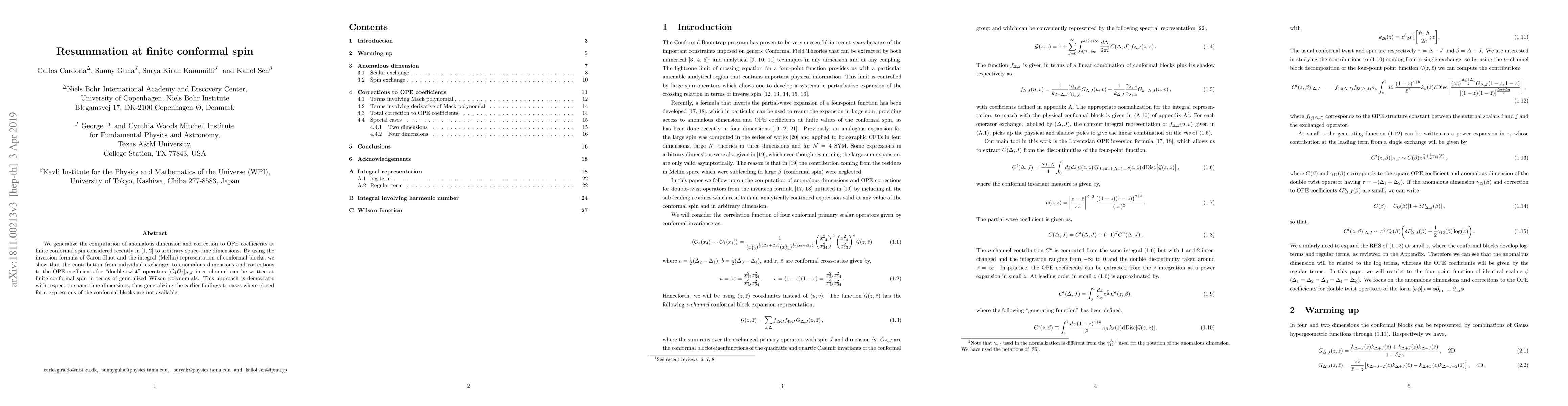 This paper generalizes the computation of anomalous dimensions and OPE coefficient corrections at finite conformal spin to any space-time dimension, using the inversion formula and Mellin representation. It expresses contributions from individual exchanges in terms of generalized Wilson polynomials, extending previous results where closed form expressions for conformal blocks were unavailable.