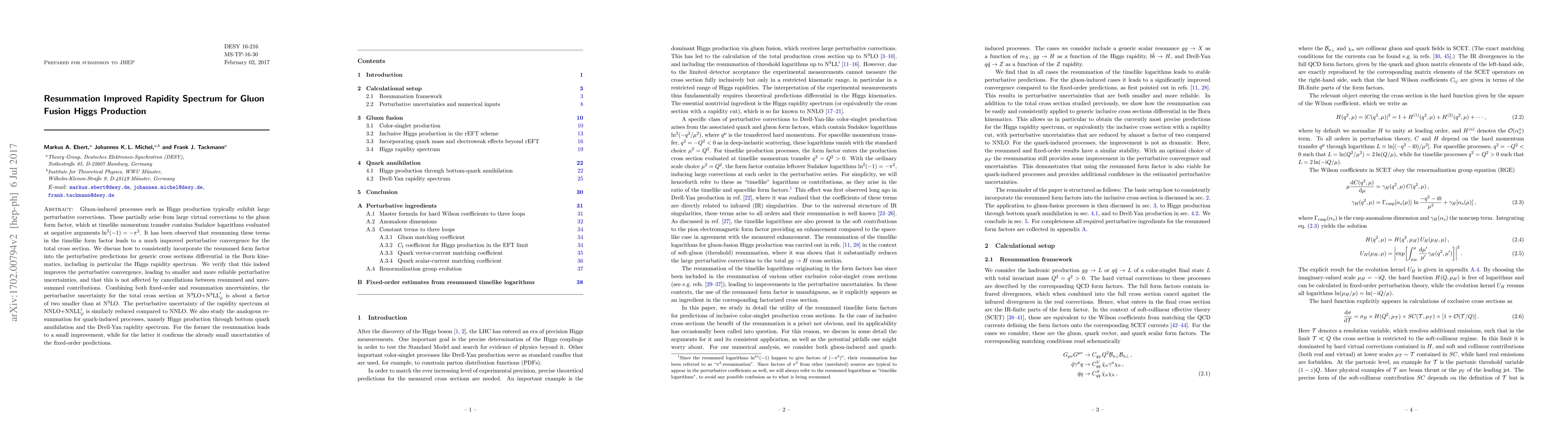 This study improves perturbative convergence for Higgs production by resumming virtual corrections in the gluon form factor, leading to smaller uncertainties and more reliable predictions for the rapidity spectrum.