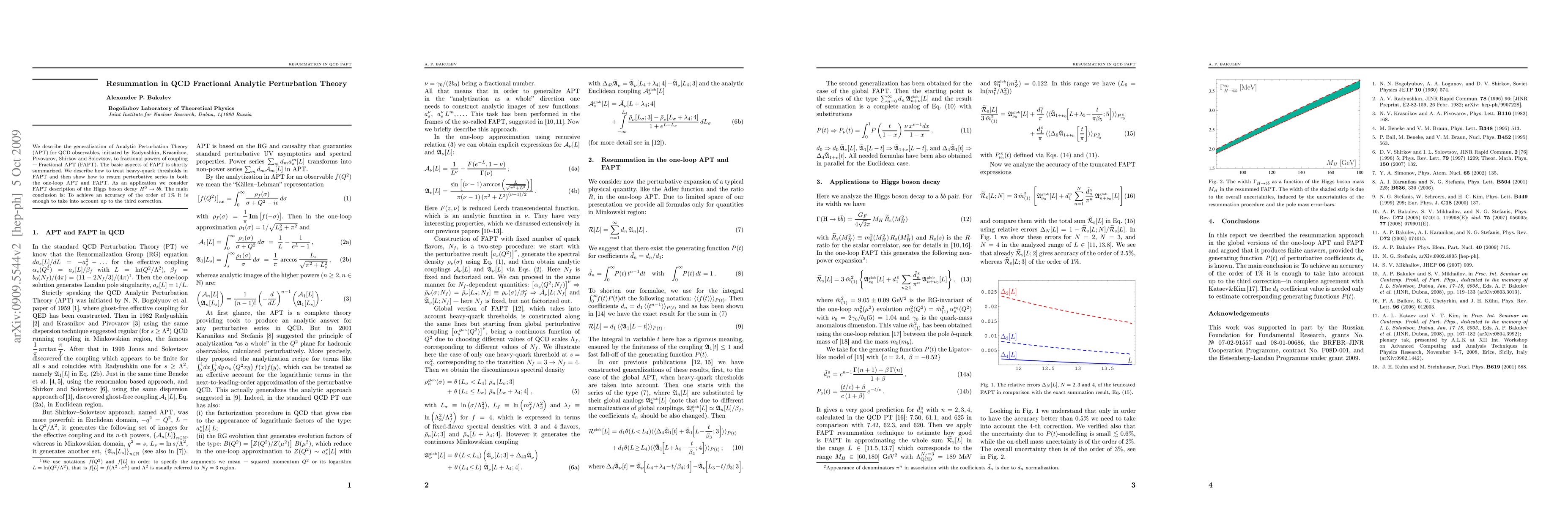 We describe the generalization of Analytic Perturbation Theory (APT) for QCD observables, initiated by Radyushkin, Krasnikov, Pivovarov, Shirkov and Solovtsov, to fractional powers of coupling -- Fractional APT (FAPT). The basic aspects of FAPT is shortly summarized. We describe how to treat heavy-quark thresholds in FAPT and then show how to resum perturbative series in both the one-loop APT and FAPT. As an application we consider FAPT description of the Higgs boson decay $H^0\to b\bar{b}$. The main conclusion is: To achieve an accuracy of the order of 1% it is enough to take into account up to the third correction.
