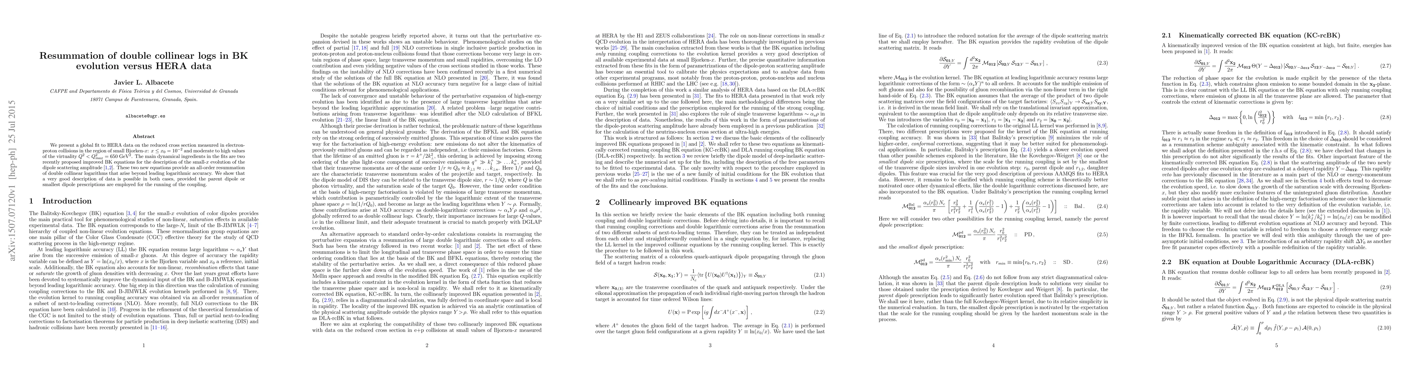 This paper presents a global fit to HERA data using improved BK equations that resum double collinear logarithms, showing excellent agreement with measurements in electron-proton collisions at small $x$ and moderate to high $Q^2$. The fit employs the parent dipole prescription for the running of the coupling, achieving precise results.