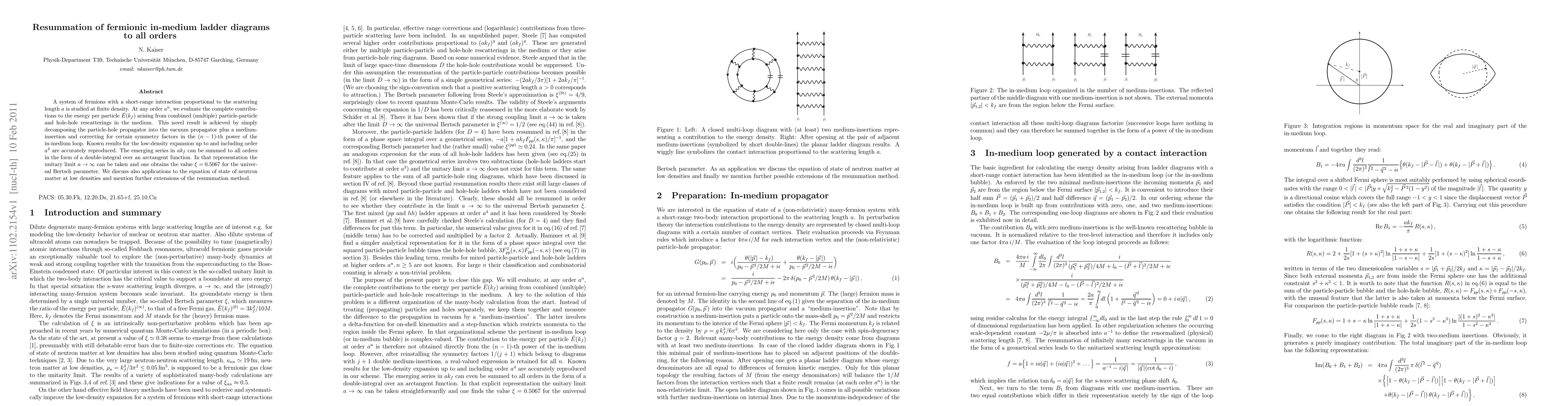 The research methodology involves the resummation of fermionic in-medium ladder diagrams to all orders using a contact interaction proportional to the scattering length. The study decomposes the particle-hole propagator and corrects for symmetry factors, enabling the evaluation of contributions to the energy per particle at finite density.