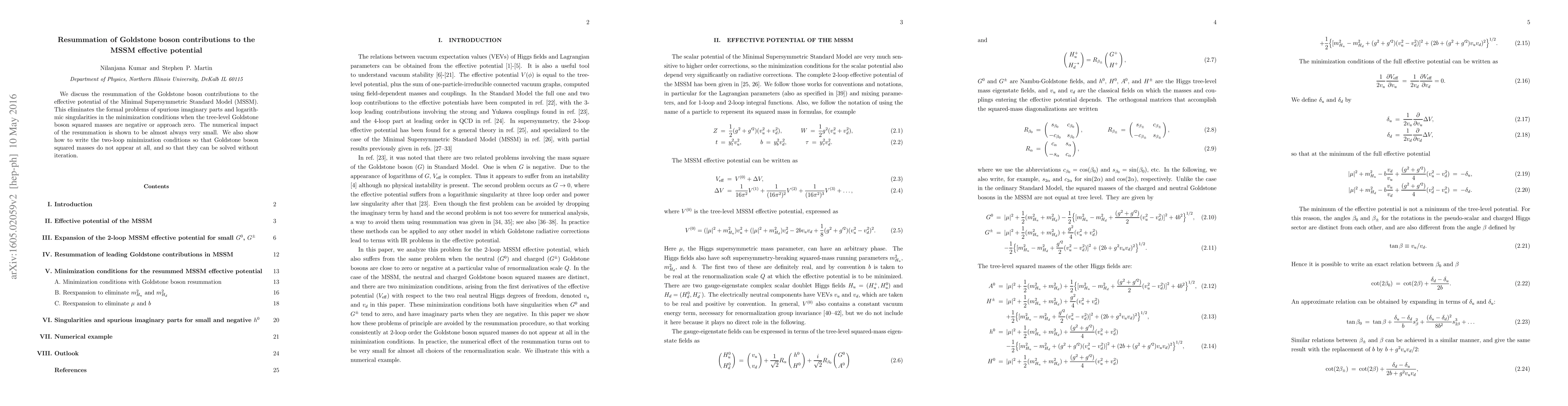 This paper addresses the resummation of Goldstone boson contributions to the MSSM effective potential, resolving issues with spurious imaginary parts and logarithmic singularities. The resummation technique is shown to have minimal numerical impact and simplifies the two-loop minimization conditions by eliminating the need for Goldstone boson squared masses.