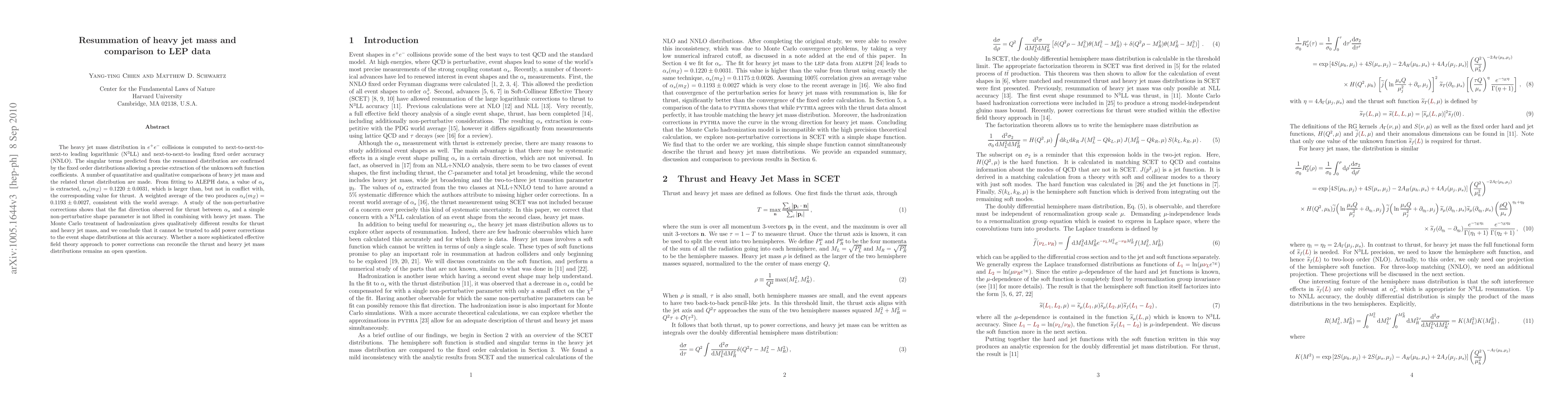 This paper computes the heavy jet mass distribution in e+e- collisions to high precision, extracting soft function coefficients and comparing results to LEP data. The study extracts alpha_s(m_Z) = 0.1220 +/- 0.0031, consistent with the world average when averaged with thrust data, but questions the reliability of Monte Carlo hadronization models for power corrections.