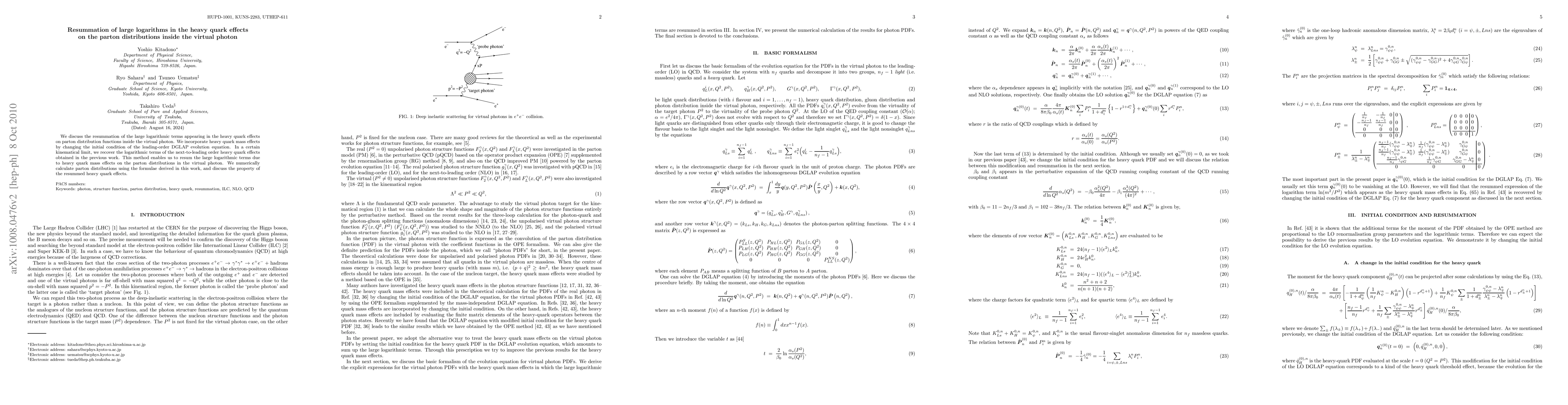 This paper presents a method to resum large logarithmic terms in heavy quark effects on parton distributions within a virtual photon, adjusting the initial condition of the leading-order DGLAP evolution equation. The approach recovers previous next-to-leading order results and numerically calculates the parton distributions, discussing the properties of the resummed heavy quark effects.