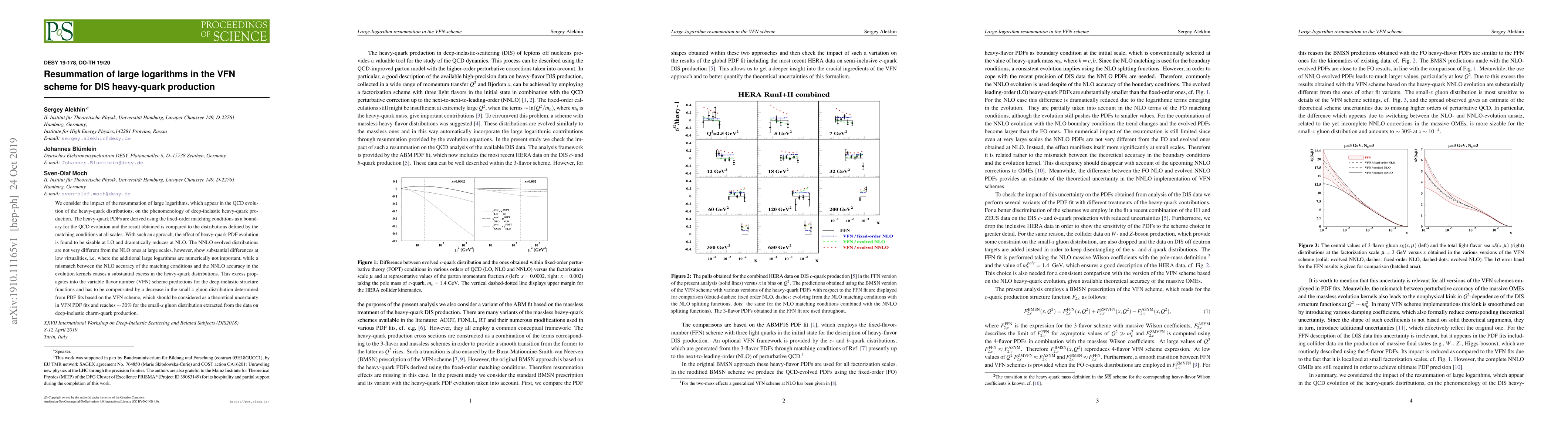 This paper studies the impact of resummation of large logarithms in the VFN scheme on deep-inelastic heavy-quark production, finding significant effects at LO that diminish at NLO and NNLO, especially at low virtualities. The mismatch between NLO matching and NNLO evolution leads to a theoretical uncertainty of about 30% in the small-$x$ gluon distribution.