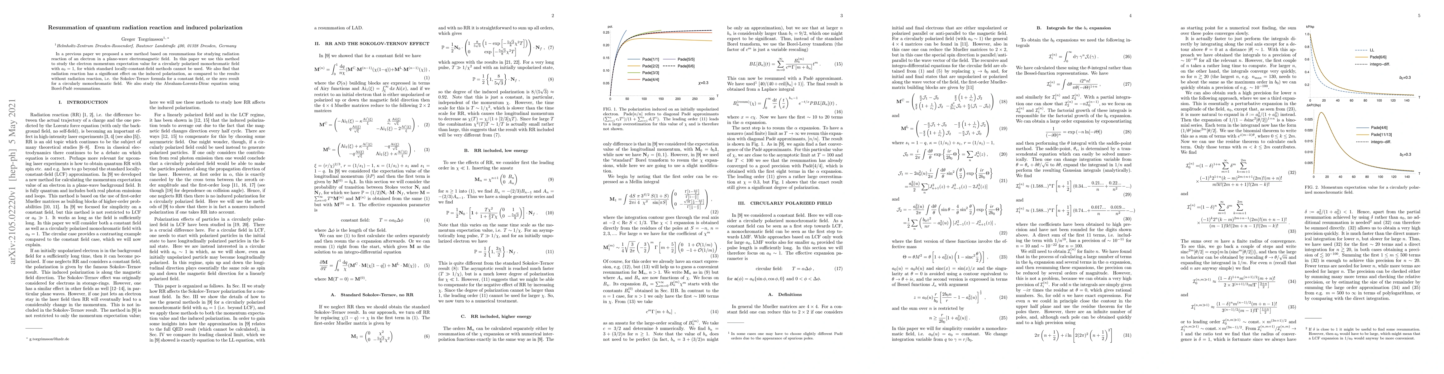 In a previous paper we proposed a new method based on resummations for studying radiation reaction of an electron in a plane-wave electromagnetic field. In this paper we use this method to study the electron momentum expectation value for a circularly polarized monochromatic field with $a_0=1$, for which standard locally-constant-field methods cannot be used. We also find that radiation reaction has a significant effect on the induced polarization, as compared to the results without radiation reaction, i.e. the Sokolov-Ternov formula for a constant field, or the zero result for a circularly monochromatic field. We also study the Abraham-Lorentz-Dirac equation using Borel-Pad\'e resummations.