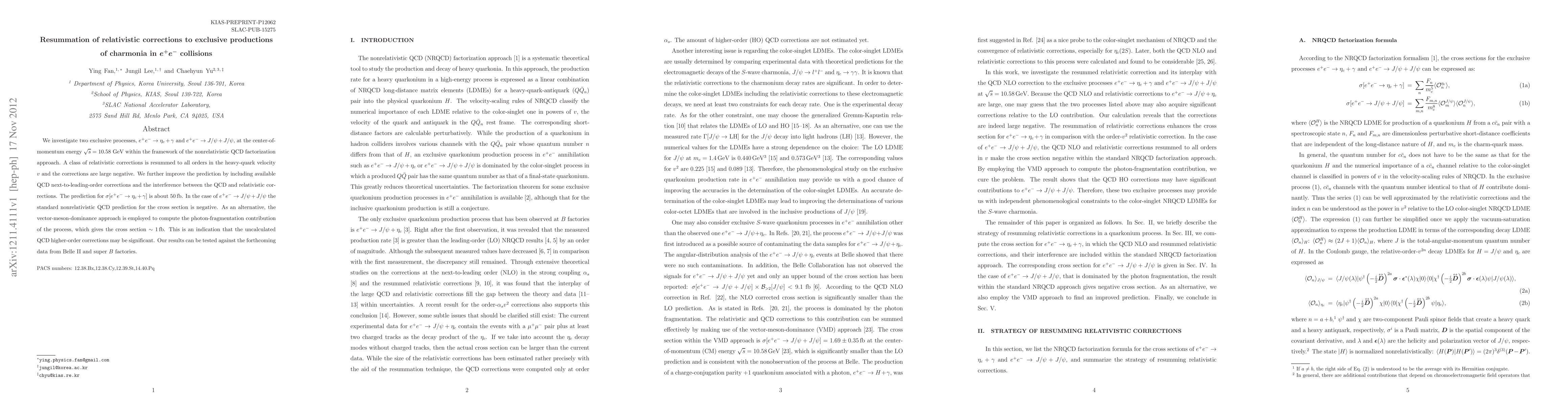 This paper studies exclusive charmonia productions in e+ e- collisions using nonrelativistic QCD, resums relativistic corrections, and combines them with QCD next-to-leading-order corrections. The predicted cross section for e+ e- -> eta_c + gamma is ~50 fb, while for e+ e- -> J/psi + J/psi, a negative standard prediction is addressed using vector-meson-dominance, yielding a ~1 fb cross section.