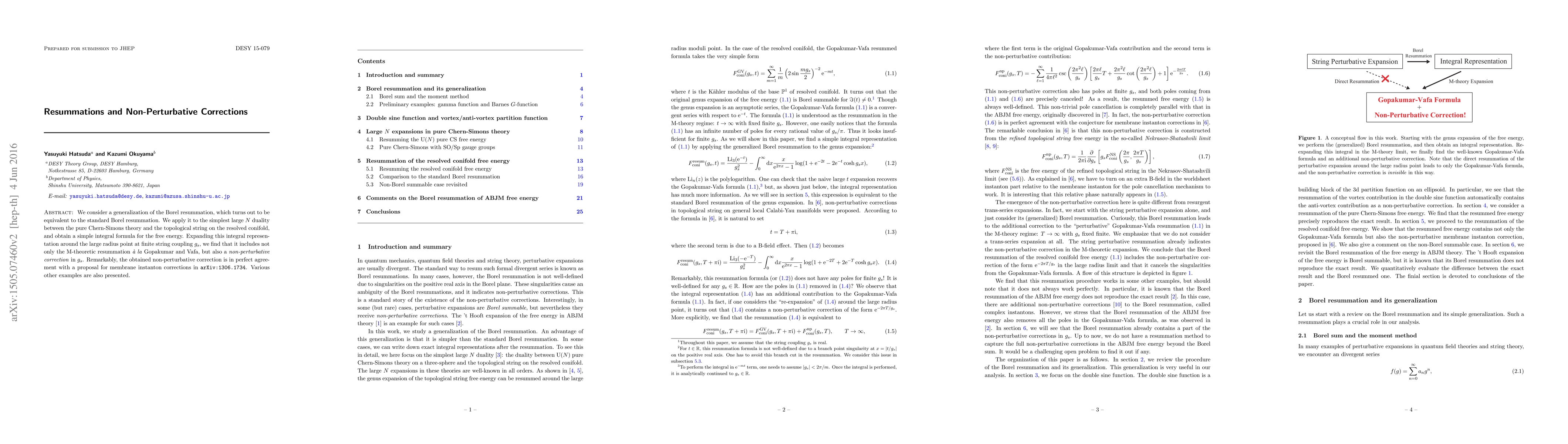 This paper generalizes Borel resummation and applies it to large N duality in Chern-Simons theory and topological string, deriving an integral formula for free energy. The expansion reveals both M-theoretic resummation and a non-perturbative correction in string coupling that aligns with membrane instanton corrections.