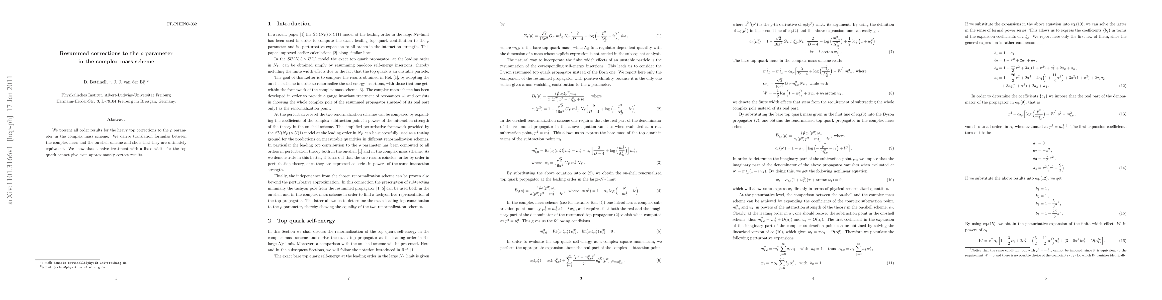 We present all order results for the heavy top corrections to the \rho parameter in the complex mass scheme. We derive translation formulas between the complex mass and the on-shell scheme and show that they are ultimately equivalent. We show that a naive treatment with a fixed width for the top quark cannot give even approximately correct results.