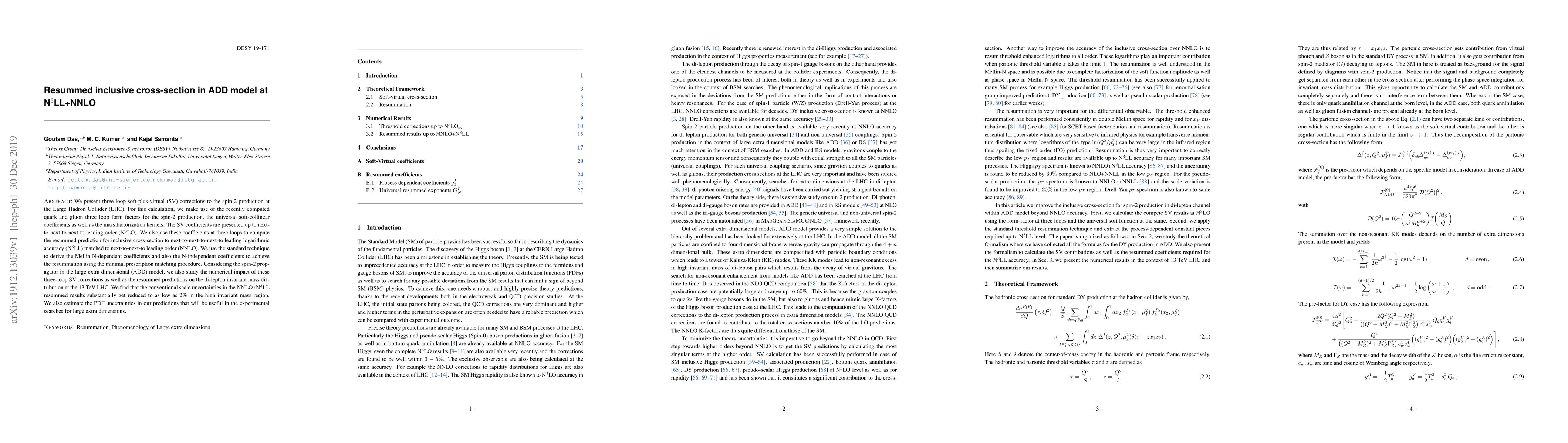 We present three loop soft-plus-virtual (SV) corrections to the spin-2 production at the Large Hadron Collider (LHC). For this calculation, we make use of the recently computed quark and gluon three loop form factors for the spin-2 production, the universal soft-collinear coefficients as well as the mass factorization kernels. The SV coefficients are presented up to next-to-next-to-next-to leading order (N$^3$LO). We also use these coefficients at three loops to compute the resummed prediction for inclusive cross-section to next-to-next-to-next-to leading logarithmic accuracy (N$^3$LL) matched to next-to-next-to leading order (NNLO). We use the standard technique to derive the Mellin N-dependent coefficients and also the N-independent coefficients to achieve the resummation using the minimal prescription matching procedure. Considering the spin-2 propagator in the large extra dimensional (ADD) model, we also study the numerical impact of these three-loop SV corrections as well as the resummed predictions on the di-lepton invariant mass distribution at the 13 TeV LHC. We find that the conventional scale uncertainties in the NNLO+N$^3$LL resummed results substantially get reduced to as low as 2\% in the high invariant mass region. We also estimate the PDF uncertainties in our predictions that will be useful in the experimental searches for large extra dimensions.