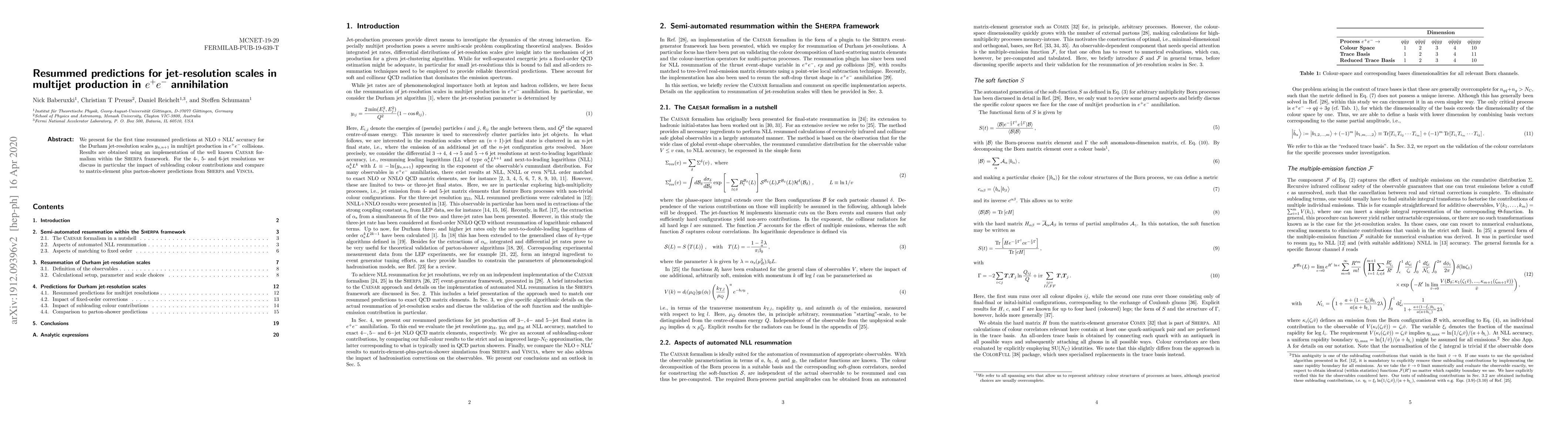 This paper provides resummed predictions at NLO + NLL' accuracy for Durham jet-resolution scales in multijet production during $e^+e^-$ annihilation, utilizing the CAESAR formalism within the SHERPA framework. It examines the impact of subleading color contributions and compares results to predictions from SHERPA and VINCIA.