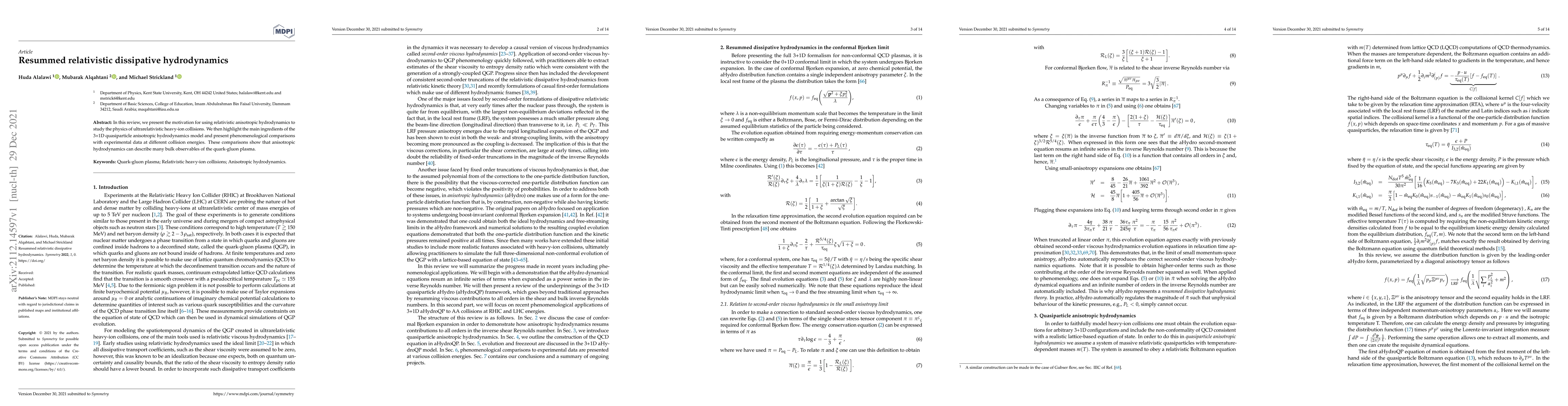 This review outlines the application of relativistic anisotropic hydrodynamics to ultrarelativistic heavy-ion collisions, detailing a 3+1D quasiparticle model and demonstrating its effectiveness in describing quark-gluon plasma observables through comparisons with experimental data.