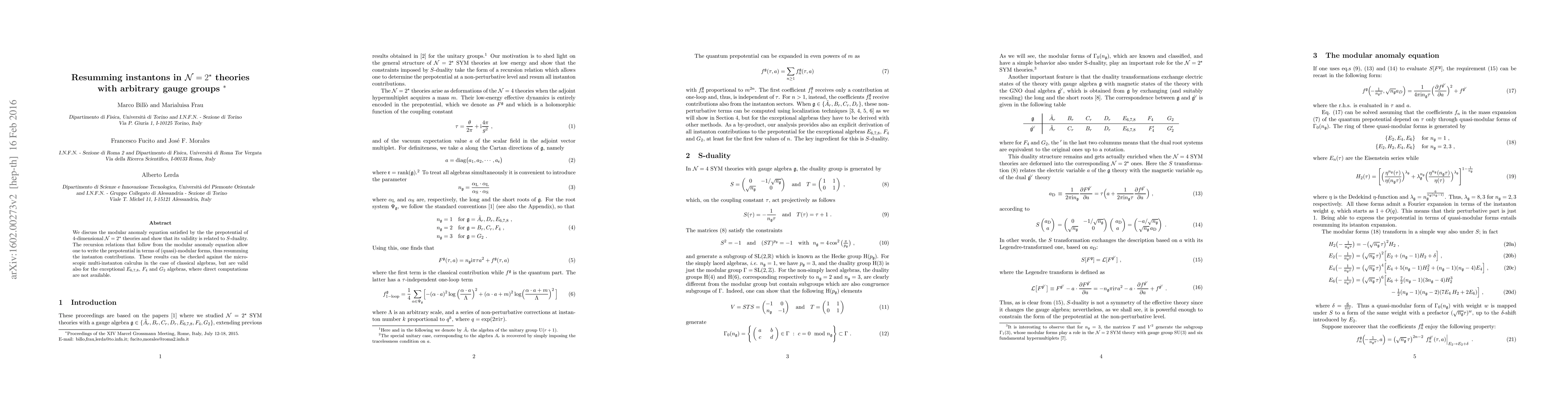 We discuss the modular anomaly equation satisfied by the the prepotential of 4-dimensional N=2* theories and show that its validity is related to S-duality. The recursion relations that follow from the modular anomaly equation allow one to write the prepotential in terms of (quasi)-modular forms, thus resumming the instanton contributions. These results can be checked against the microscopic multi-instanton calculus in the case of classical algebras, but are valid also for the exceptional E6, E7, E8, F4 and G2 algebras, where direct computations are not available.