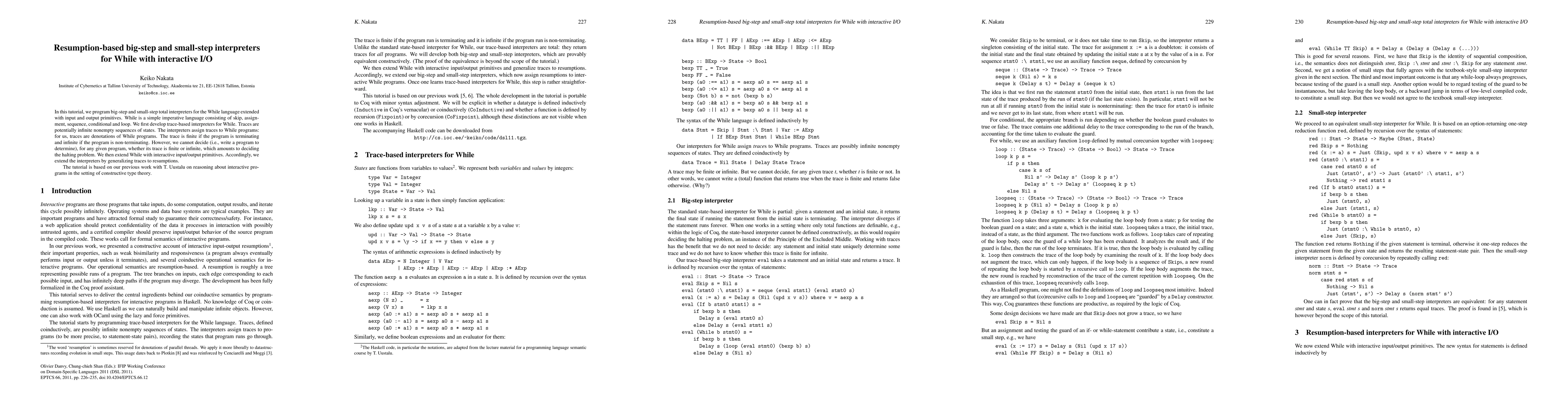 This paper develops big-step and small-step interpreters for the While language, extended with input/output primitives, using resumptions to handle potentially infinite traces. The tutorial builds on prior work in constructive type theory to reason about interactive programs.