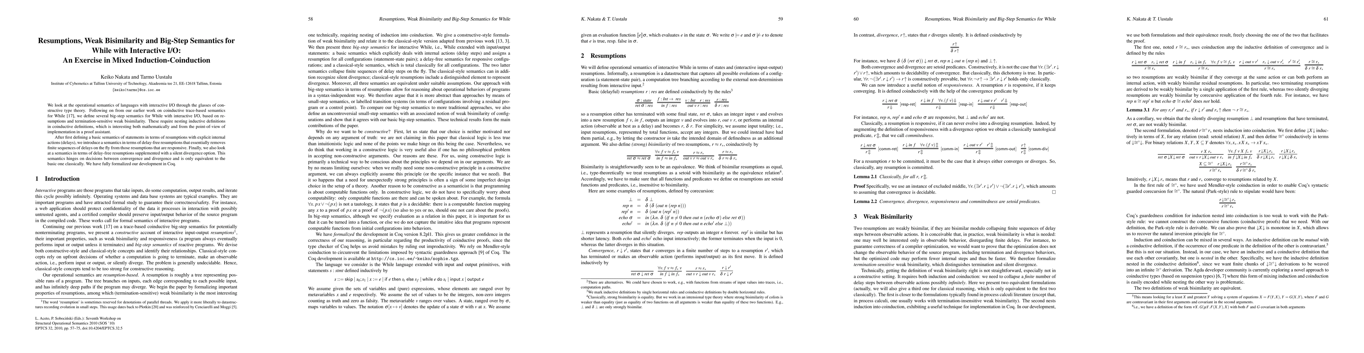 This paper explores the operational semantics of While languages with interactive I/O using constructive type theory, defining big-step semantics based on resumptions and weak bisimilarity. The authors formalize these semantics, including delay-free resumptions and silent divergence, in Coq, highlighting the interplay between induction and coinduction.