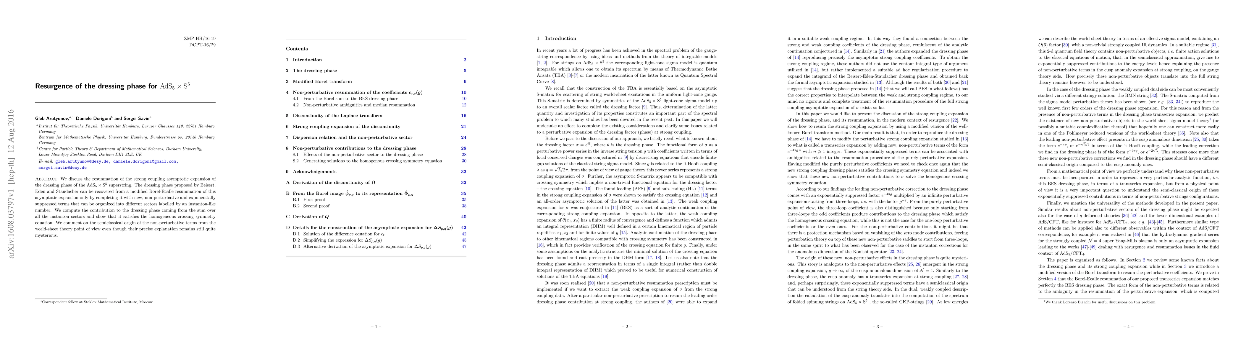 We discuss the resummation of the strong coupling asymptotic expansion of the dressing phase of the ${\rm AdS}_5\times {\rm S}^5$ superstring. The dressing phase proposed by Beisert, Eden and Staudacher can be recovered from a modified Borel-Ecalle resummation of this asymptotic expansion only by completing it with new, non-perturbative and exponentially suppressed terms that can be organized into different sectors labelled by an instanton-like number. We compute the contribution to the dressing phase coming from the sum over all the instanton sectors and show that it satisfies the homogeneous crossing symmetry equation. We comment on the semiclassical origin of the non-perturbative terms from the world-sheet theory point of view even though their precise explanation remains still quite mysterious.