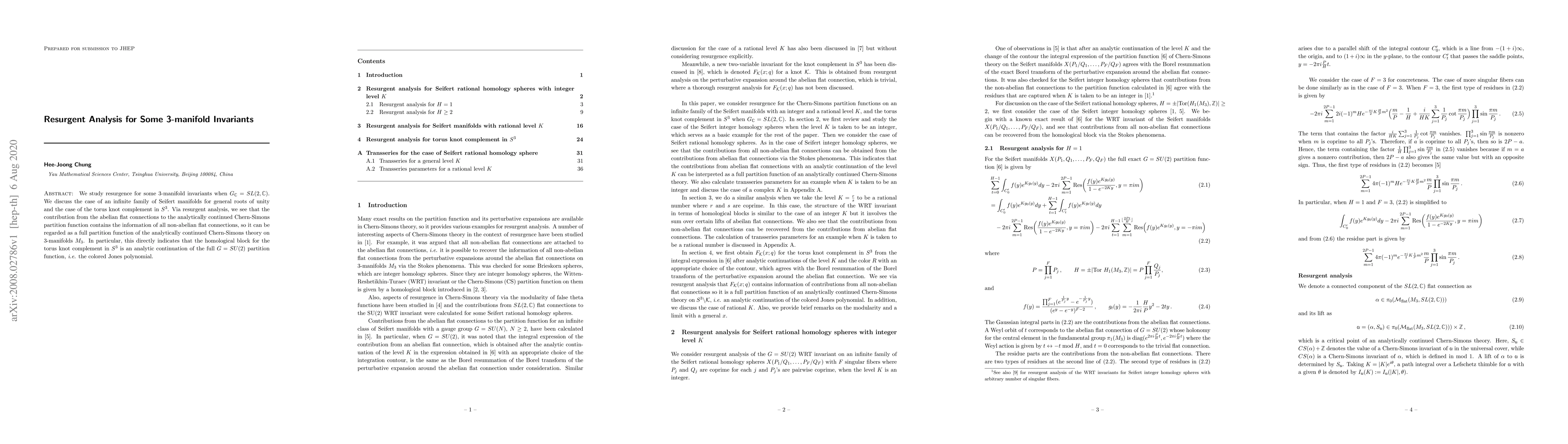 This paper investigates resurgence in 3-manifold invariants for $G_{\mathbb{C}}=SL(2,\mathbb{C})$, focusing on Seifert manifolds and torus knot complements. It reveals that the abelian flat connections' contribution fully encapsulates non-abelian flat connections, indicating the homological block for torus knots is an analytic continuation of the full $SU(2)$ partition function.