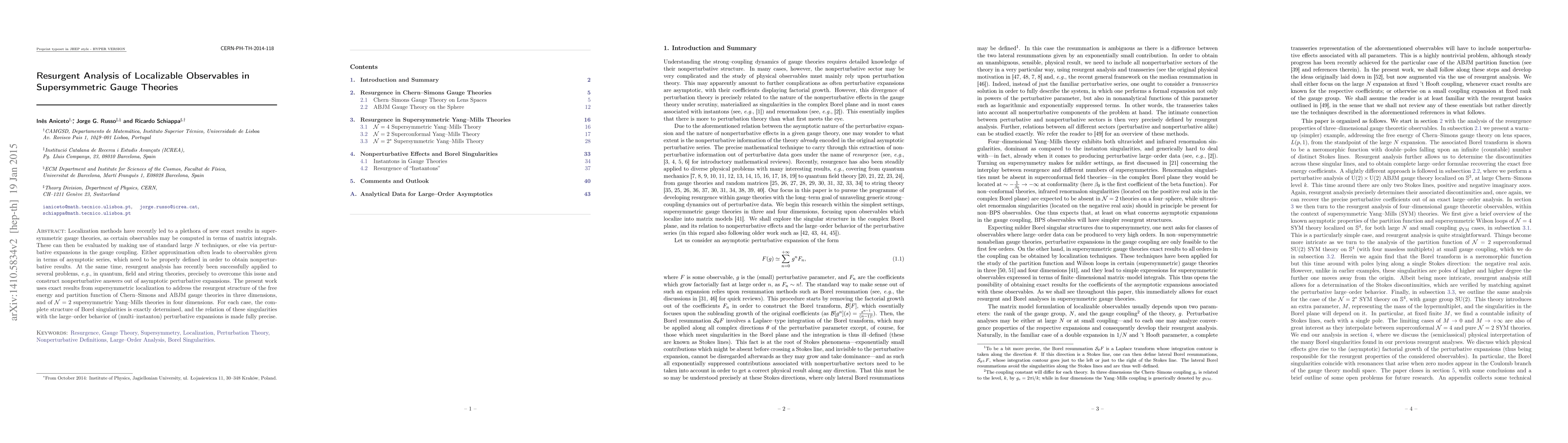 This paper employs supersymmetric localization techniques to analyze the resurgent structure of observables in various gauge theories, determining the Borel singularities of the free energy and partition functions. It connects these singularities to the large-order behavior of perturbative expansions, providing a nonperturbative approach to otherwise asymptotic results.