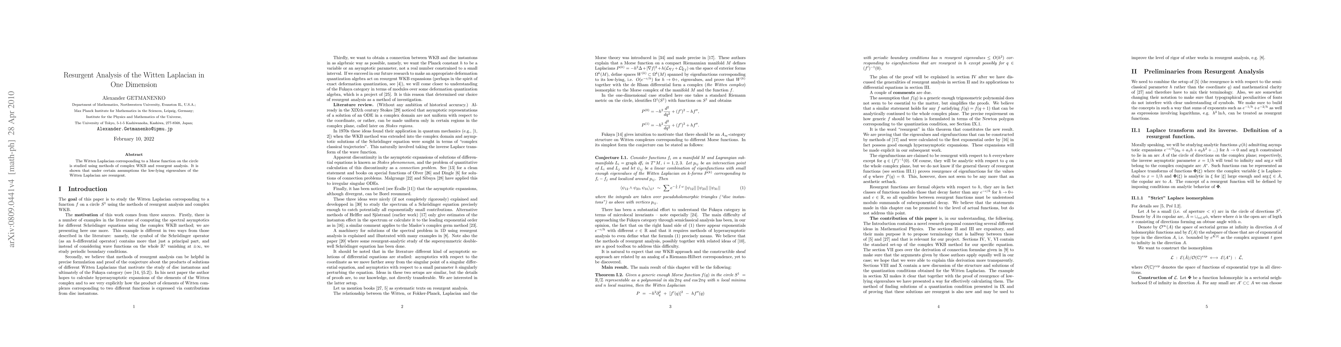 This paper employs complex WKB and resurgent analysis to study the Witten Laplacian on a one-dimensional circle, demonstrating that its low-lying eigenvalues exhibit resurgent behavior under specific conditions.